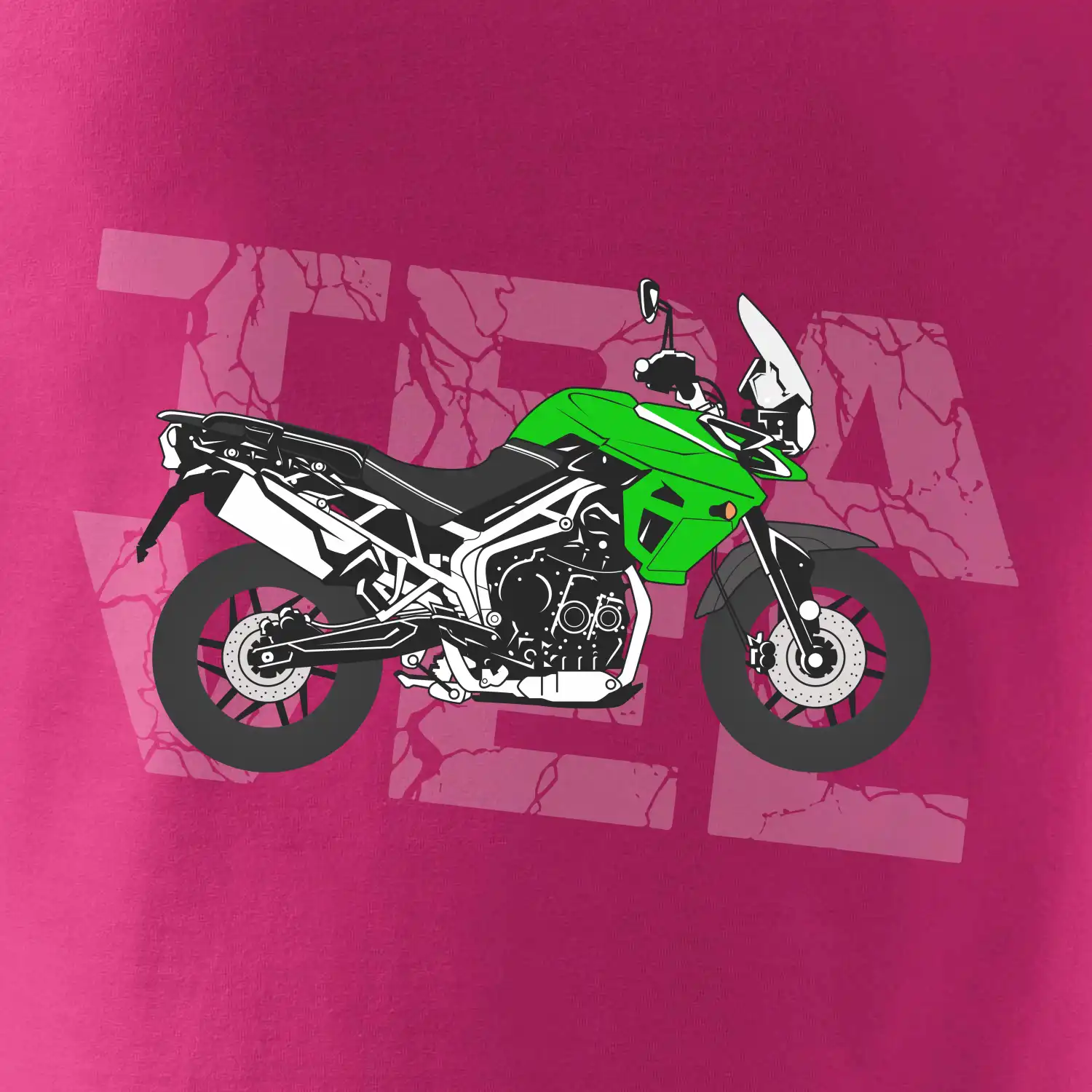 Triko pro motorkáře, na kterém je zelená cestovní enduro motorka. Motorkářské triko, kde je cestovní motorka, musí mít doma každý vášnivý motorkář. Triko s motorkou je vhodný dárek pro motorkáře.