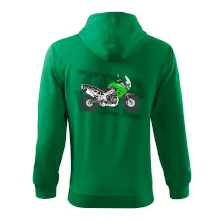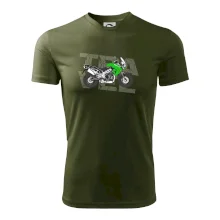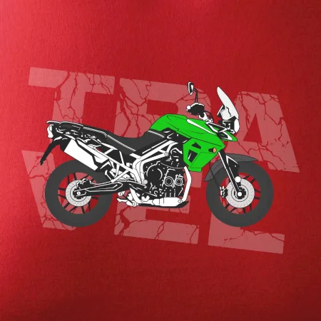 Triko pro motorkáře, na kterém je zelená cestovní enduro motorka. Motorkářské triko, kde je cestovní motorka, musí mít doma každý vášnivý motorkář. Triko s motorkou je vhodný dárek pro motorkáře.