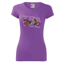 Triko pro motorkáře, na kterém je červená cestovní motorka Amerika. Motorkářské triko, kde je cestovní motorka, musí mít doma každý vášnivý motorkář. Triko s motorkou je vhodný dárek pro motorkáře.