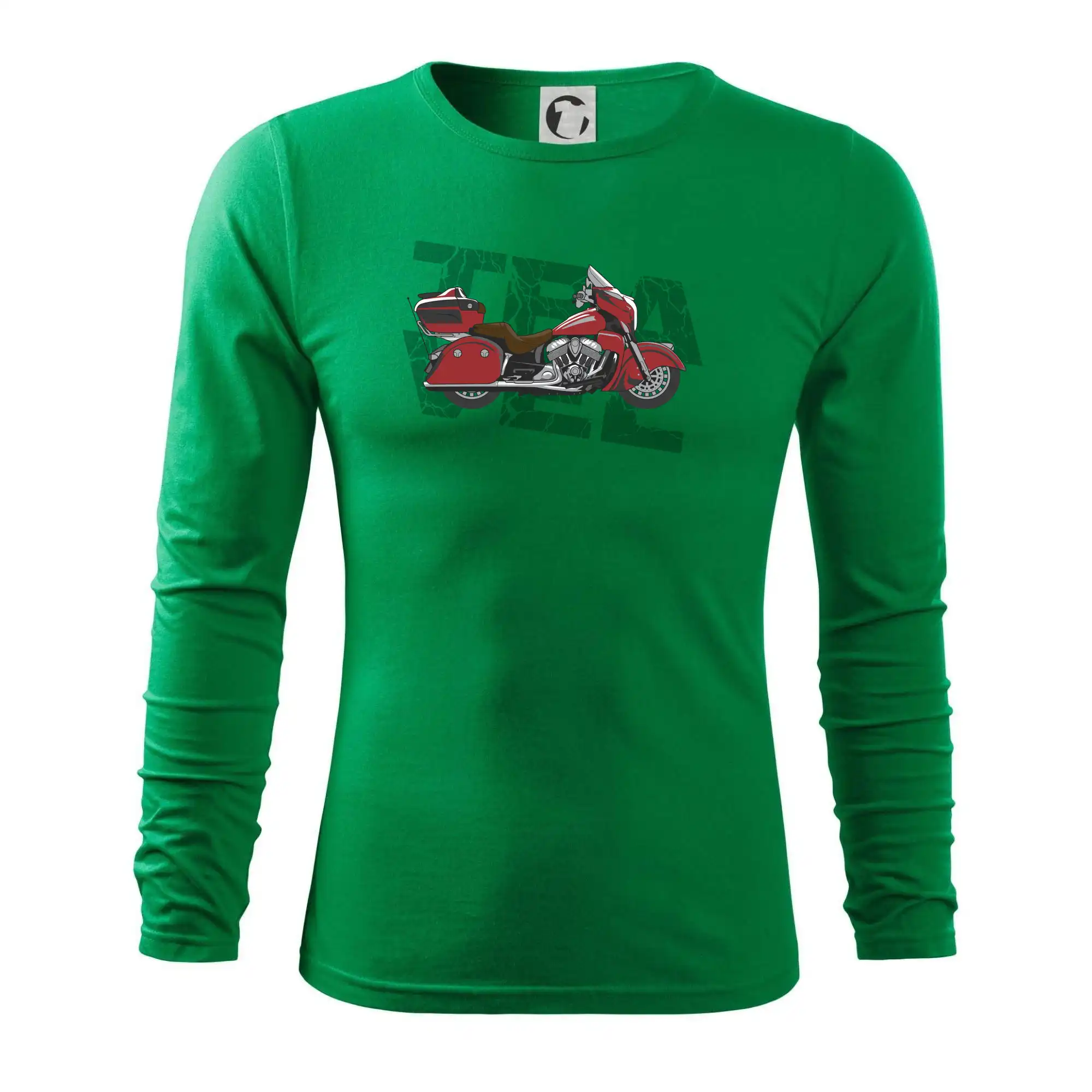 Triko pro motorkáře, na kterém je červená cestovní motorka Amerika. Motorkářské triko, kde je cestovní motorka, musí mít doma každý vášnivý motorkář. Triko s motorkou je vhodný dárek pro motorkáře.