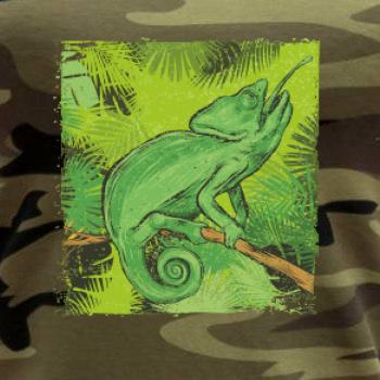 Triko s chameleonem pro milovníka zvířat a přírody. Zelený chameleon vykukuje z džungle. Pokud je chameleon tvé oblíbené zvíře, tohle triko s chameleonem musíš mít doma.