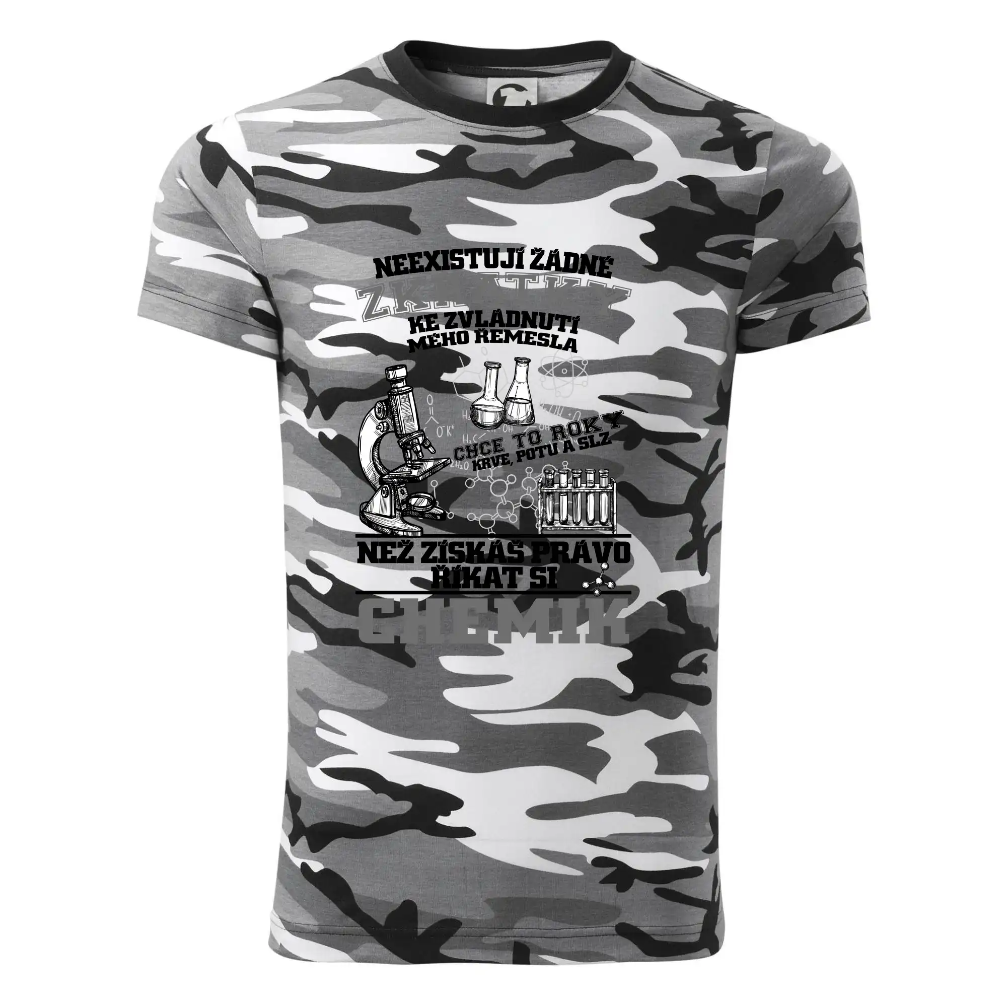 Skvělý dárek pro chemika, triko s chemickými přístroji na tričku. Dárek pro učitele chemie s chemickými baňkami na tričku.