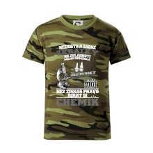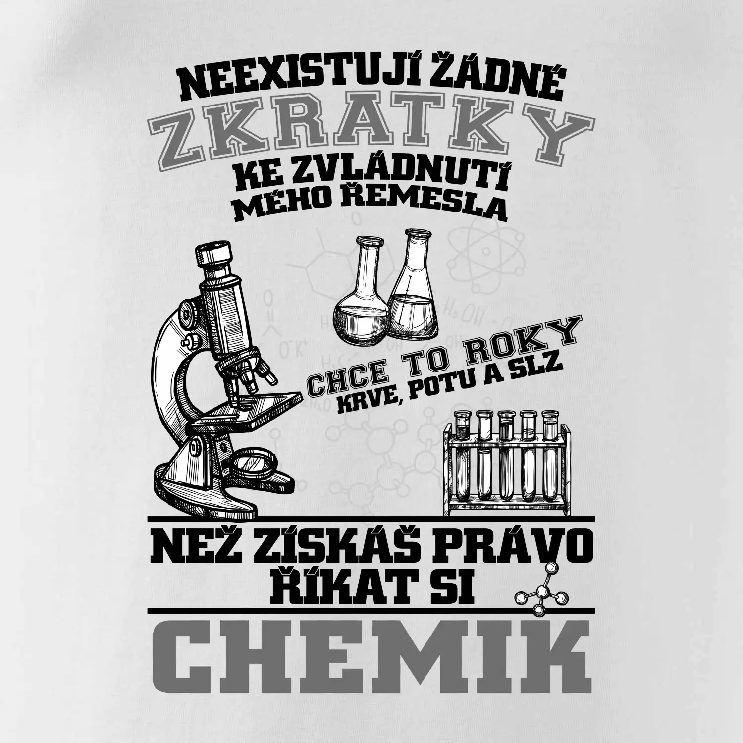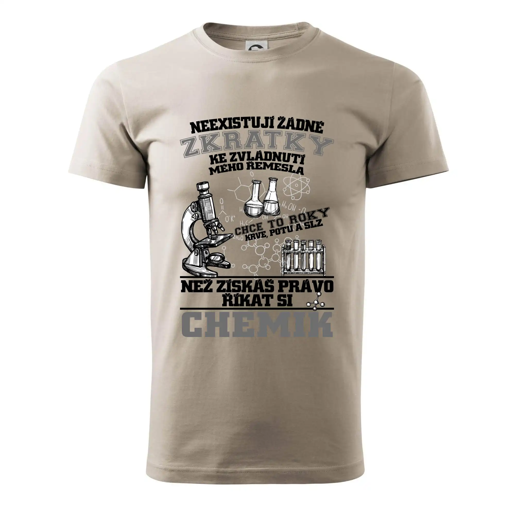 Skvělý dárek pro chemika, triko s chemickými přístroji na tričku. Dárek pro učitele chemie s chemickými baňkami na tričku.