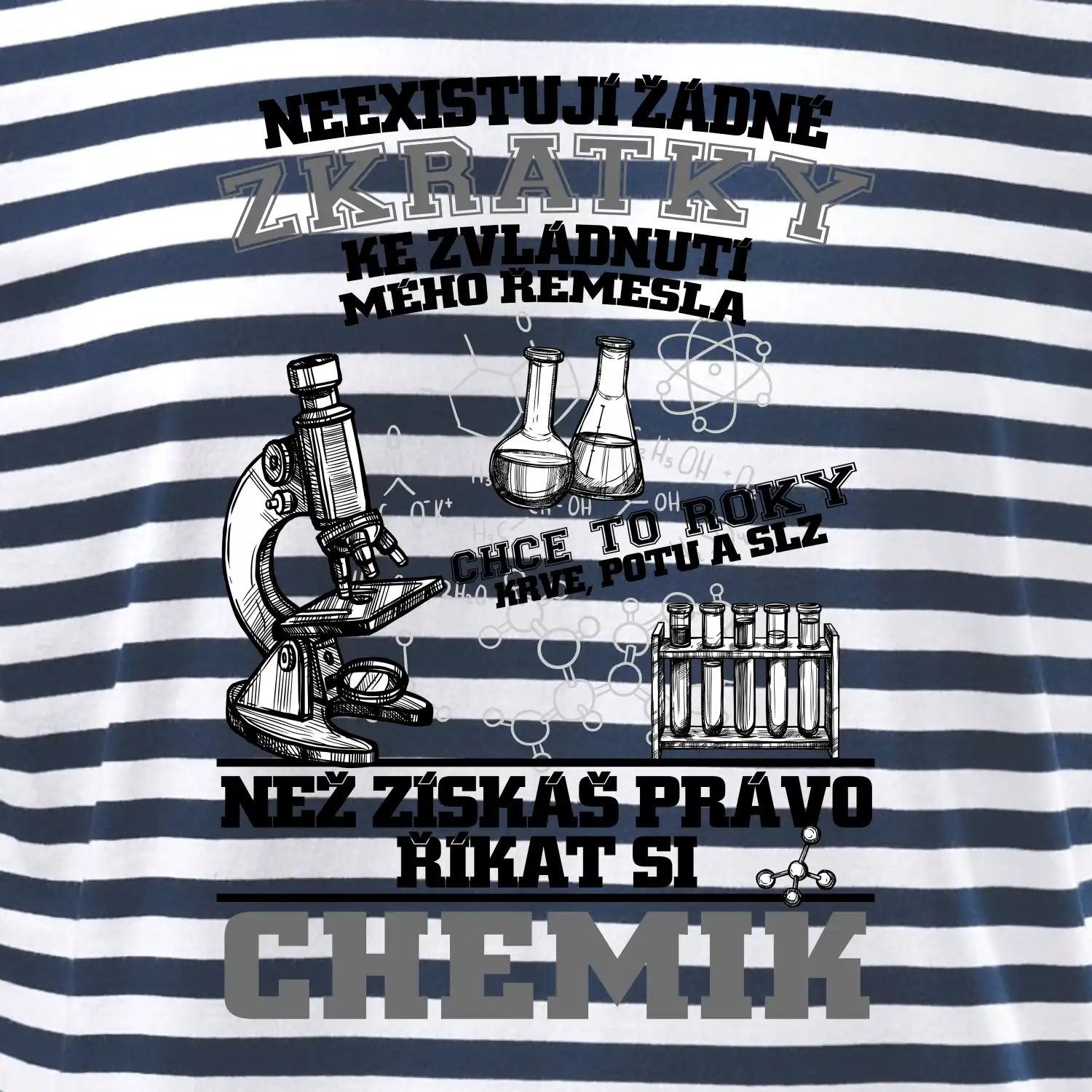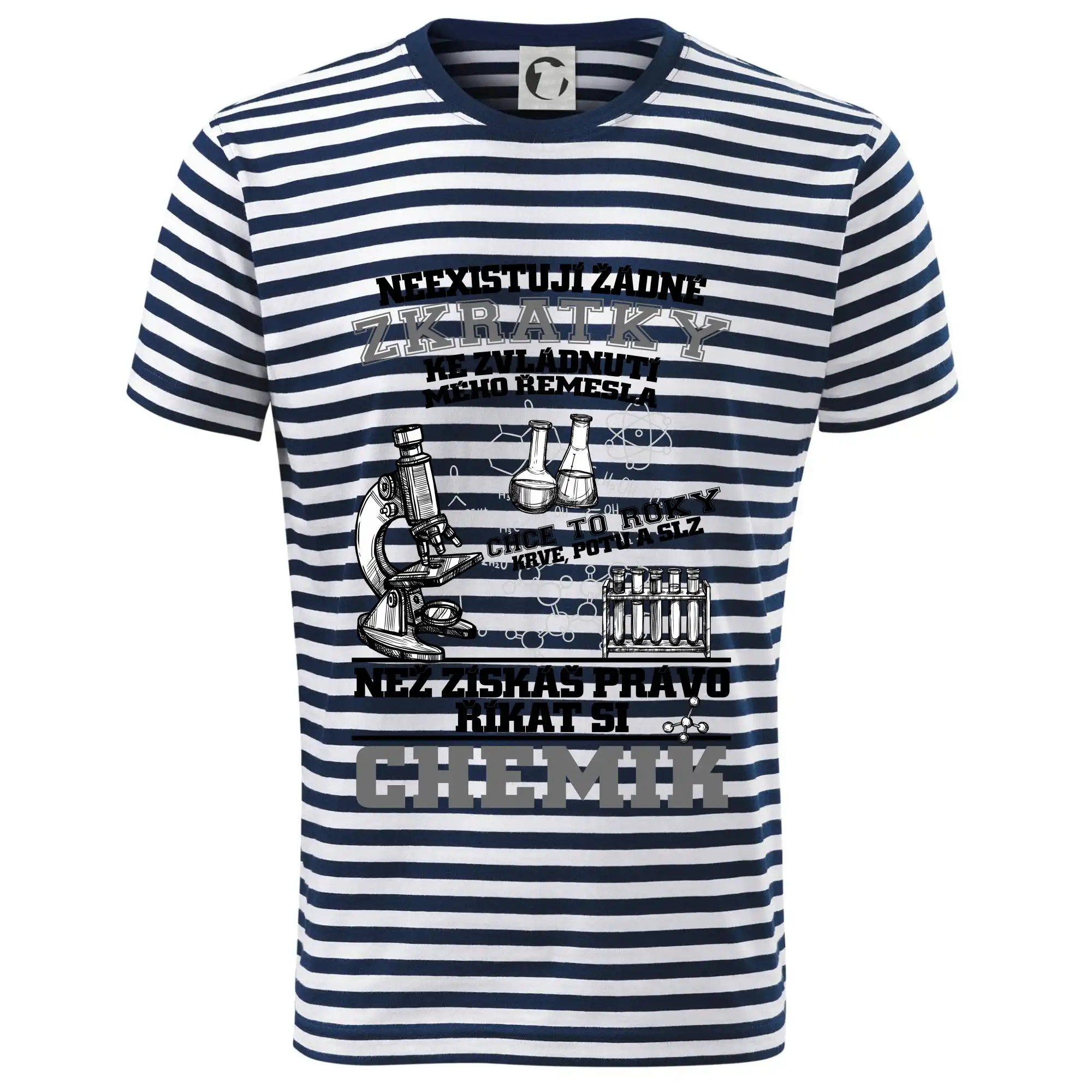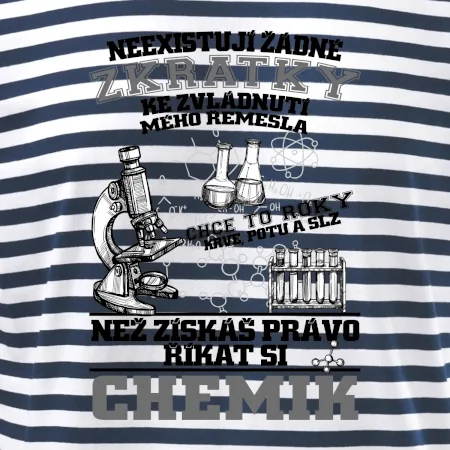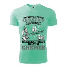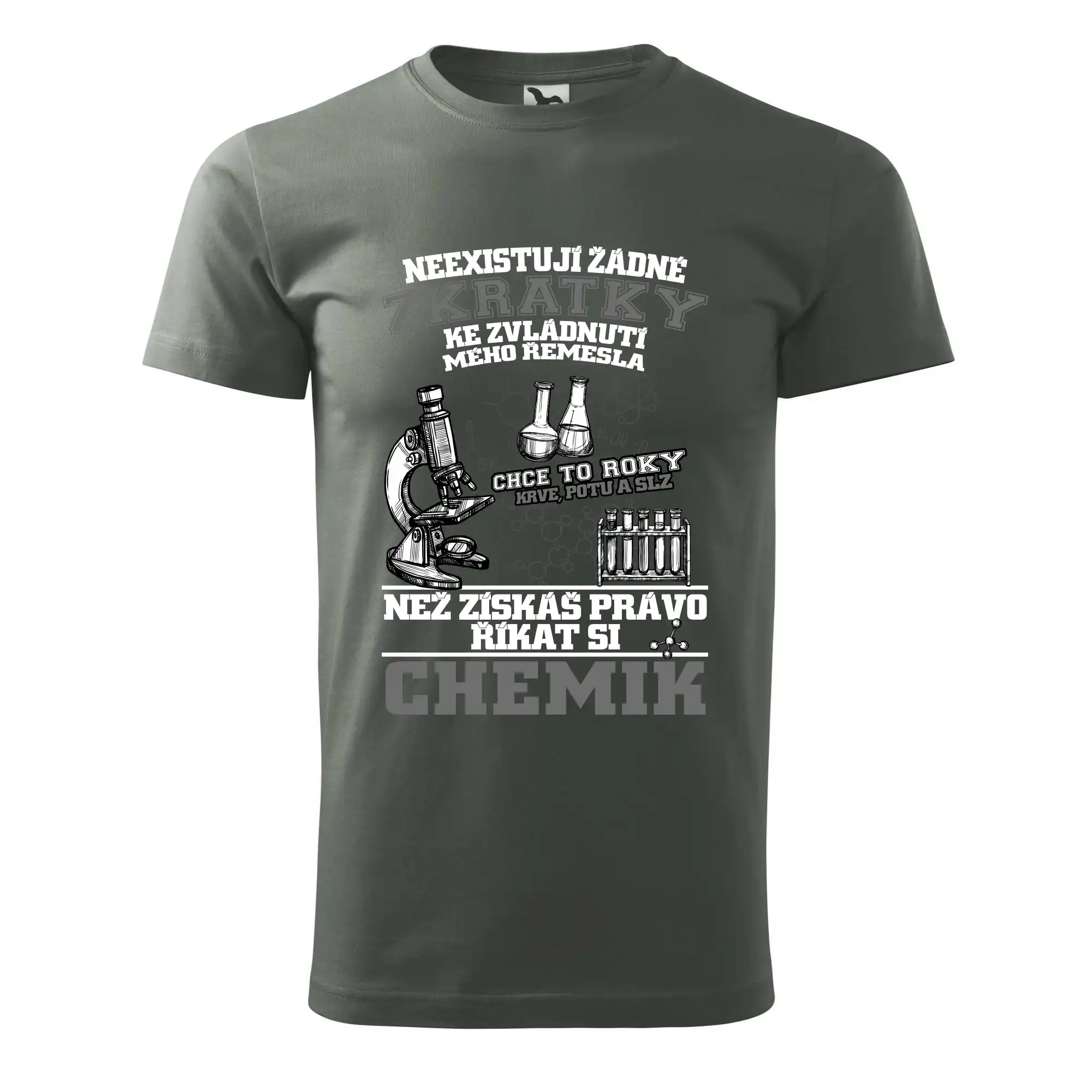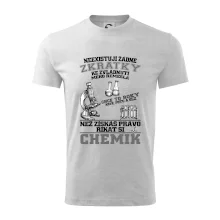 Skvělý dárek pro chemika, triko s chemickými přístroji na tričku. Dárek pro učitele chemie s chemickými baňkami na tričku.