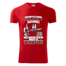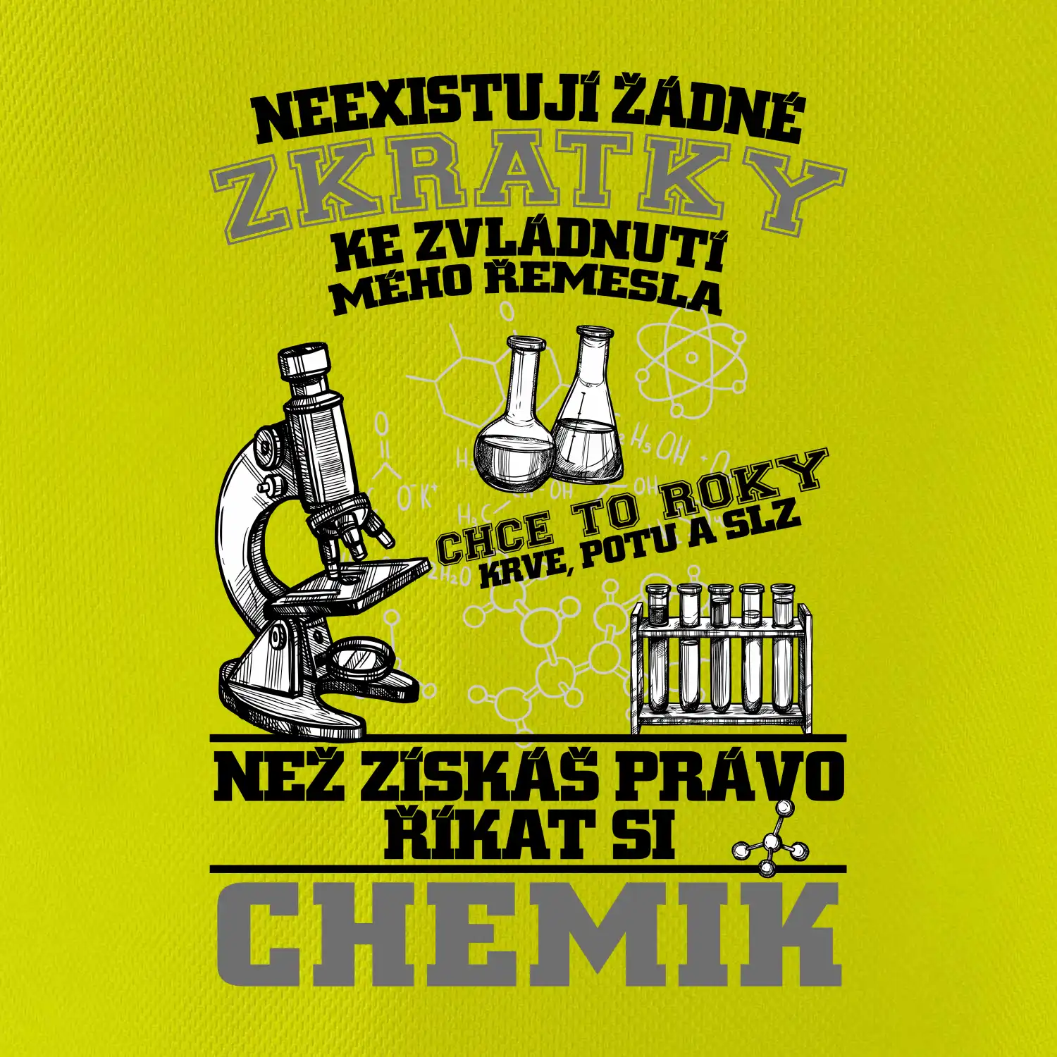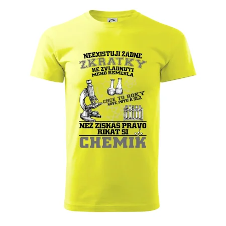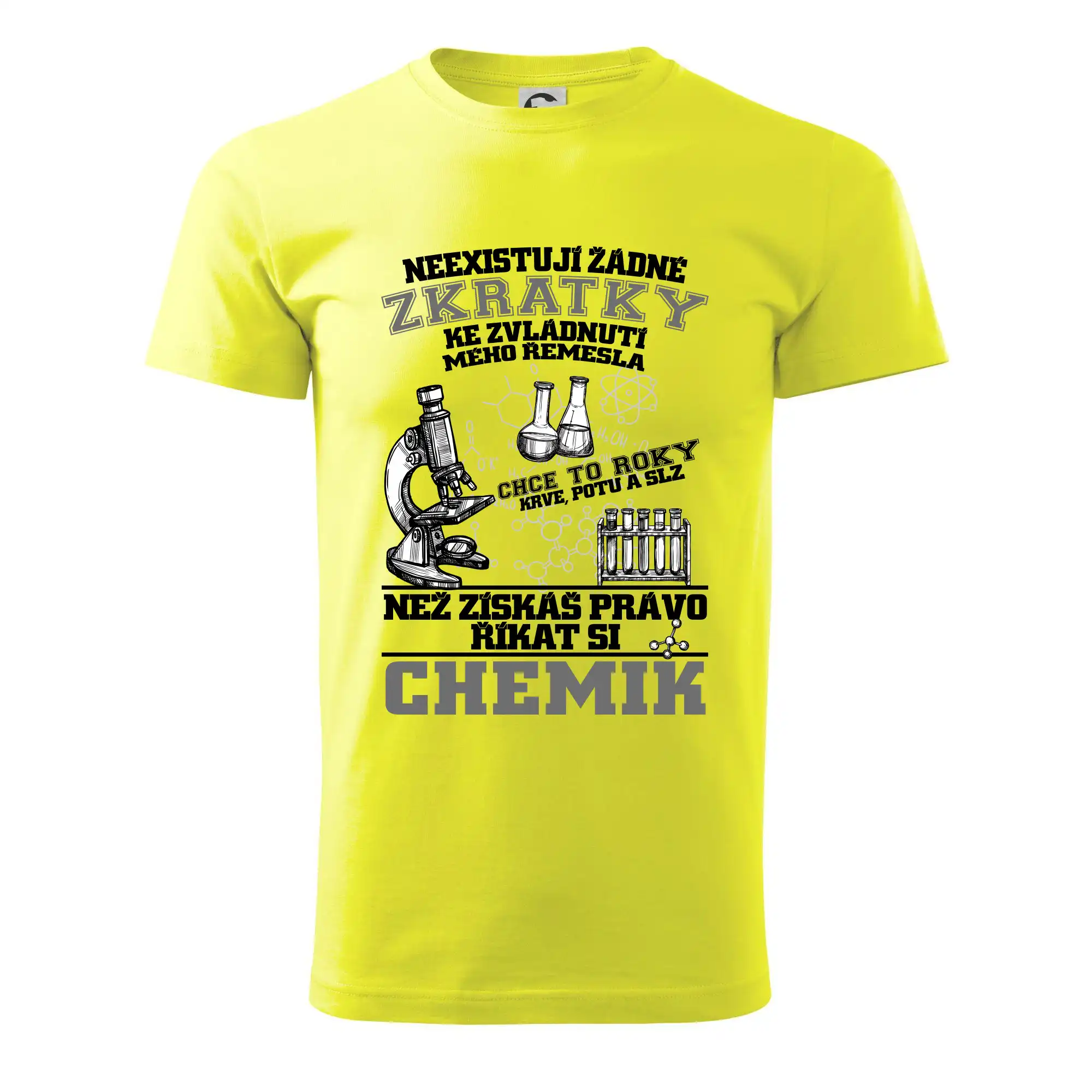 Skvělý dárek pro chemika, triko s chemickými přístroji na tričku. Dárek pro učitele chemie s chemickými baňkami na tričku.