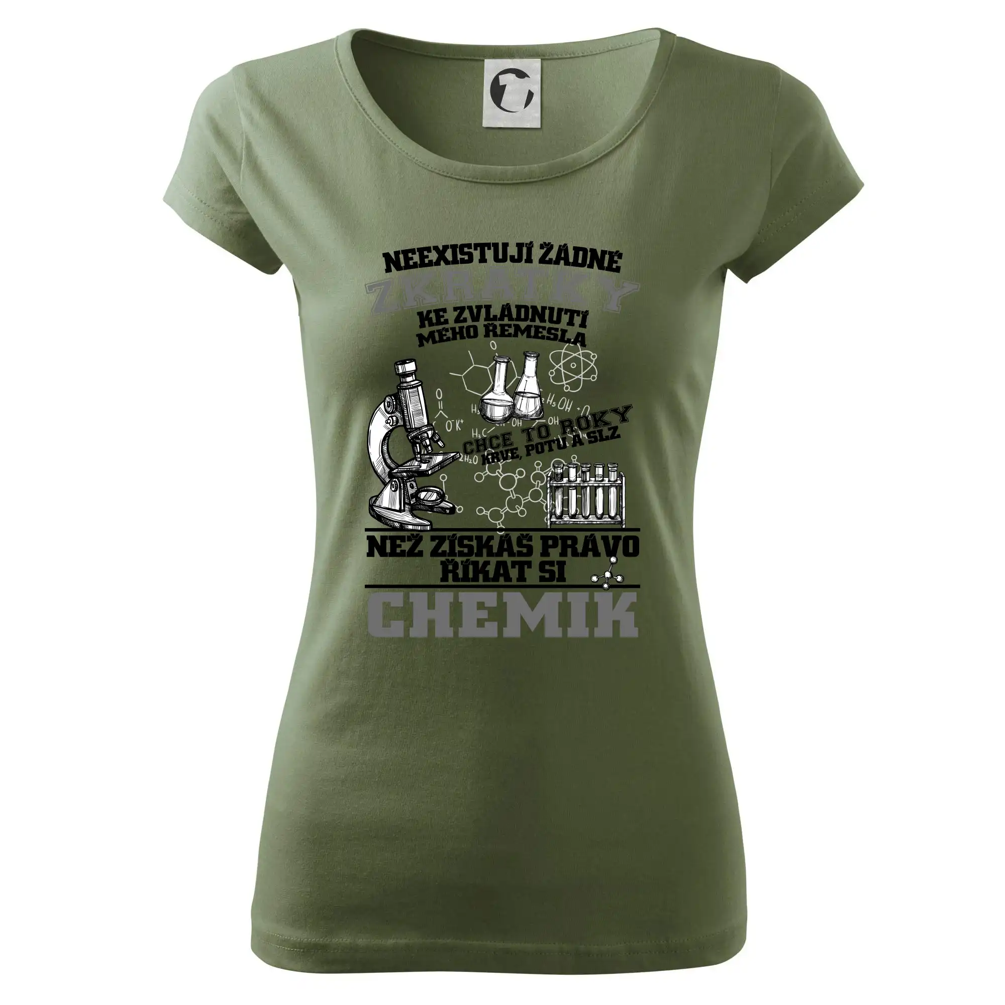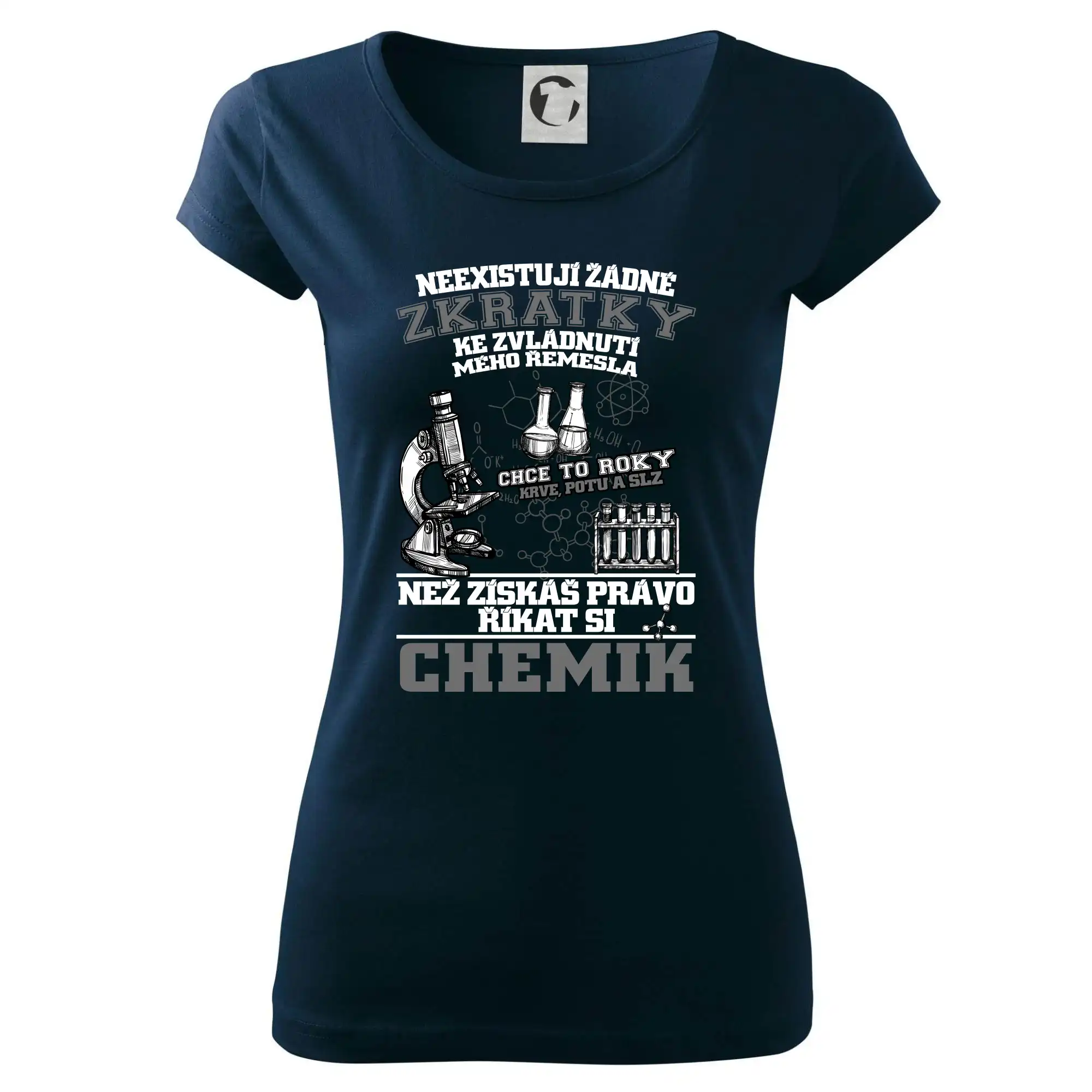 Skvělý dárek pro chemika, triko s chemickými přístroji na tričku. Dárek pro učitele chemie s chemickými baňkami na tričku.