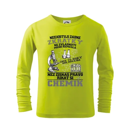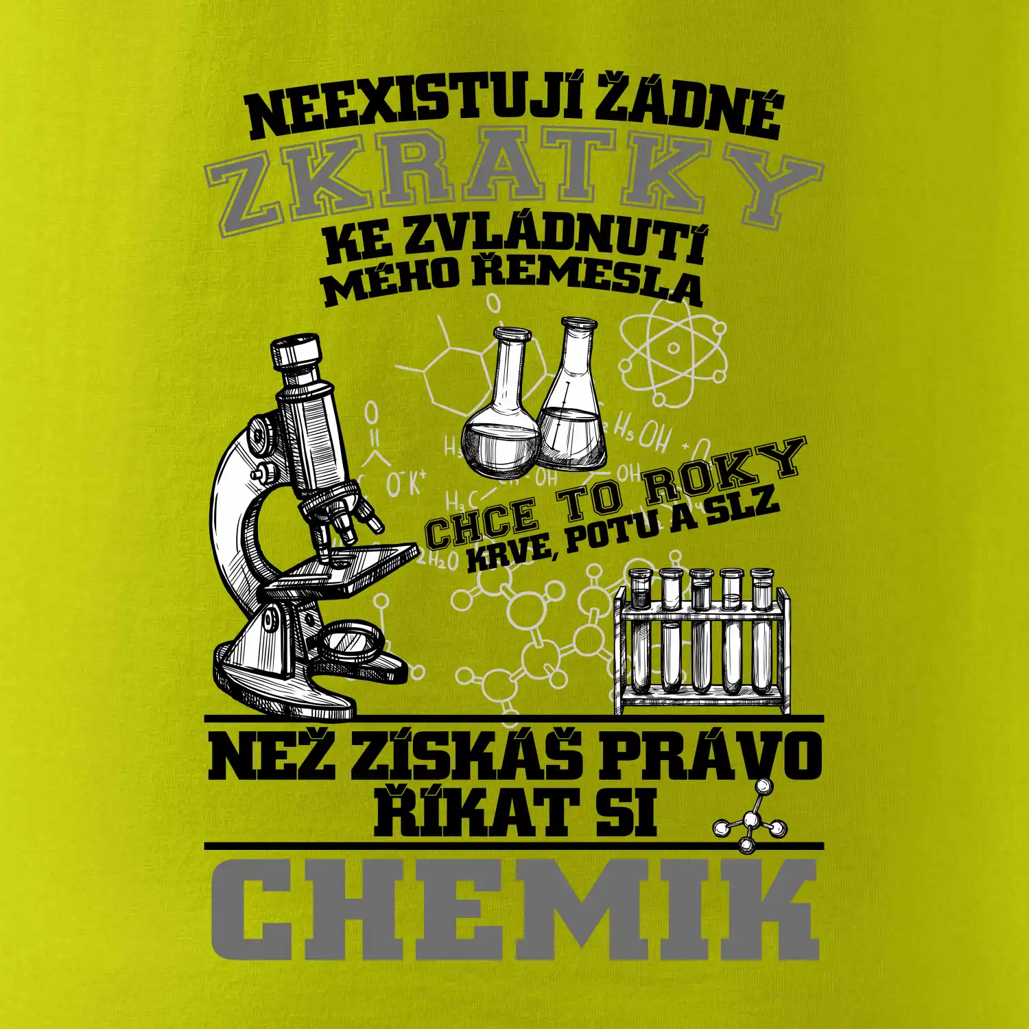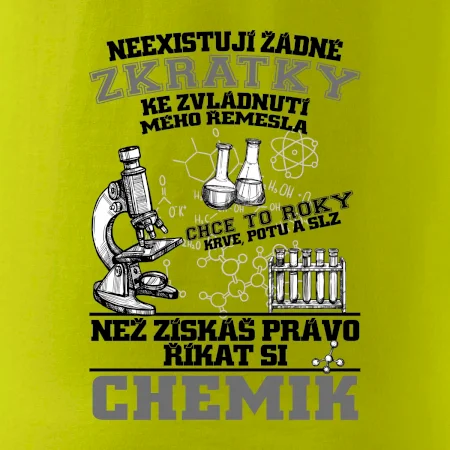 Skvělý dárek pro chemika, triko s chemickými přístroji na tričku. Dárek pro učitele chemie s chemickými baňkami na tričku.