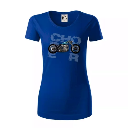 Triko pro motorkáře, na kterém je modrá motorka chopper. Motocykl by měl mít na triku každý správný motorkář. Moto triko s motorkou je vhodný dárek pro motorkáře.