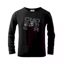 Triko pro motorkáře, na kterém je modrá motorka chopper. Motocykl by měl mít na triku každý správný motorkář. Moto triko s motorkou je vhodný dárek pro motorkáře.