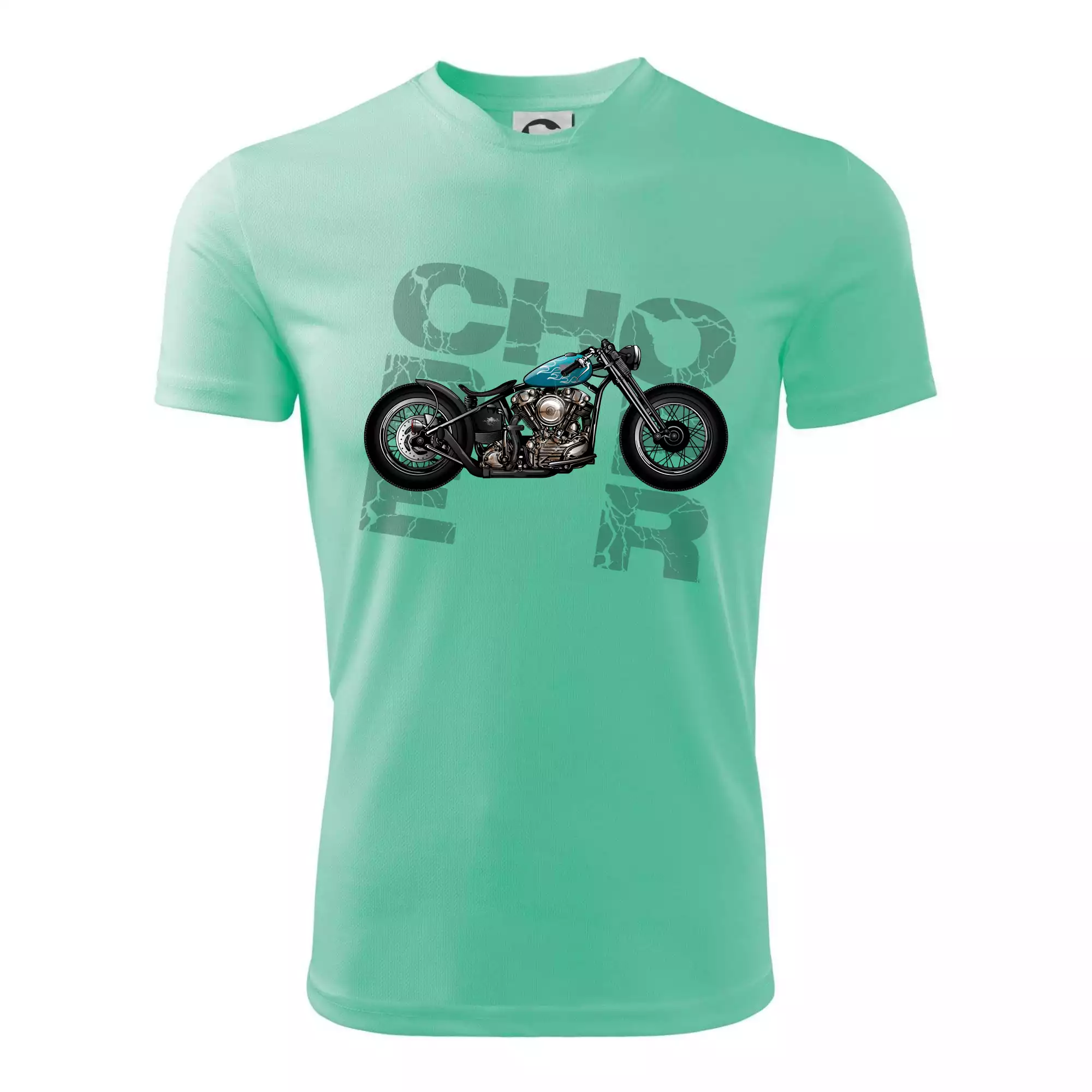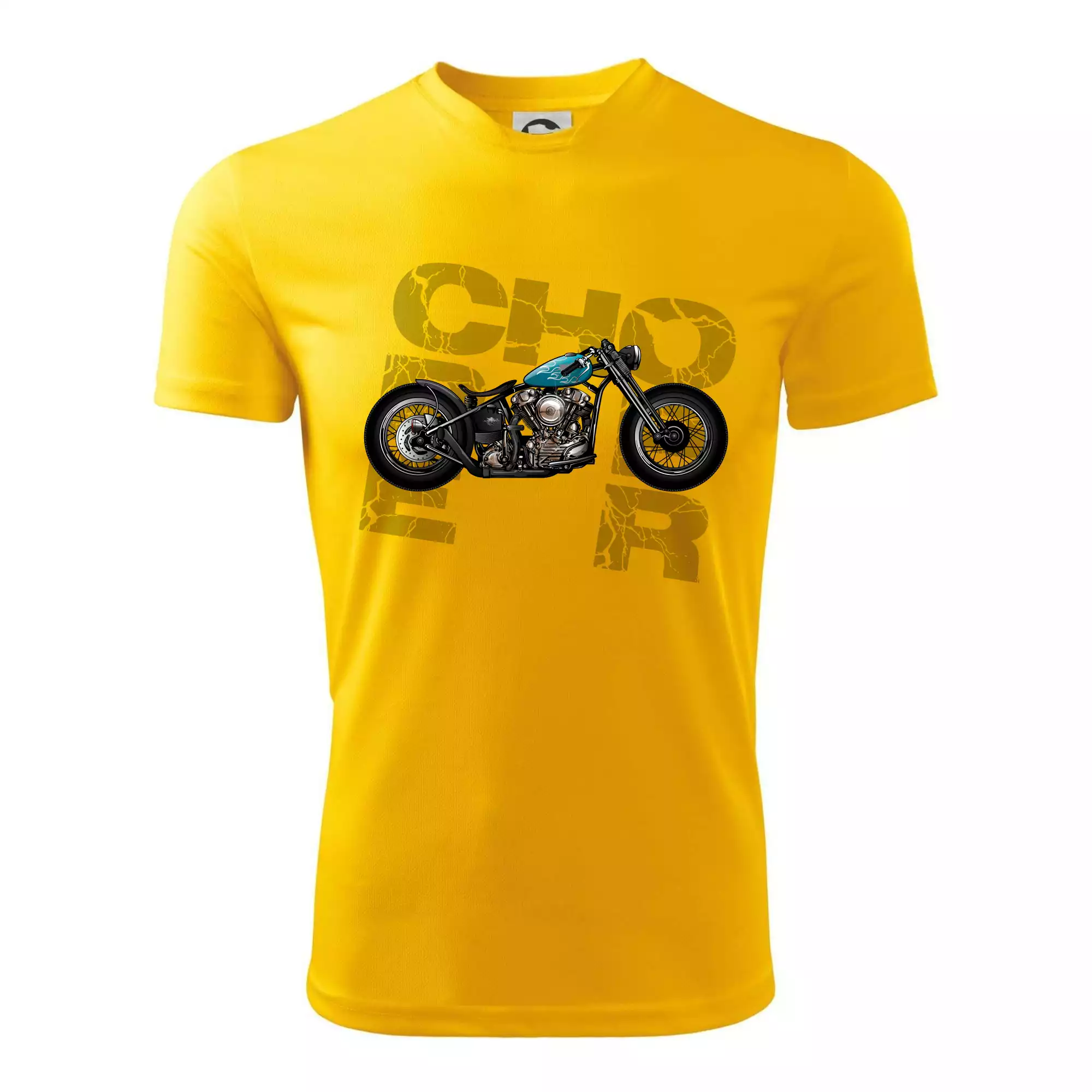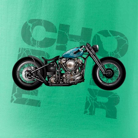 Triko pro motorkáře, na kterém je modrá motorka chopper. Motocykl by měl mít na triku každý správný motorkář. Moto triko s motorkou je vhodný dárek pro motorkáře.