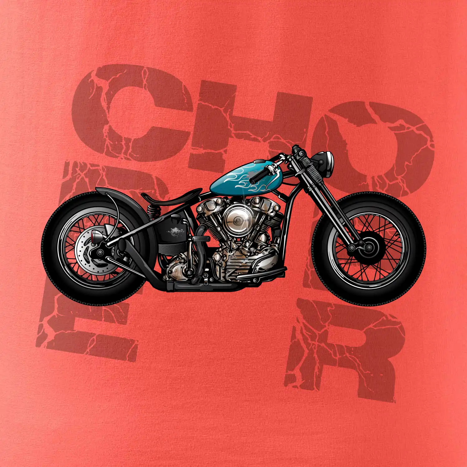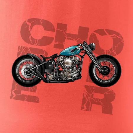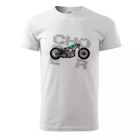 Triko pro motorkáře, na kterém je modrá motorka chopper. Motocykl by měl mít na triku každý správný motorkář. Moto triko s motorkou je vhodný dárek pro motorkáře.