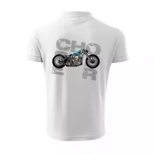 Triko pro motorkáře, na kterém je modrá motorka chopper. Motocykl by měl mít na triku každý správný motorkář. Moto triko s motorkou je vhodný dárek pro motorkáře.