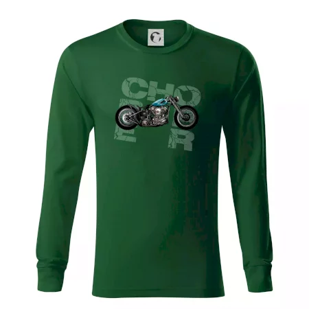 Triko pro motorkáře, na kterém je modrá motorka chopper. Motocykl by měl mít na triku každý správný motorkář. Moto triko s motorkou je vhodný dárek pro motorkáře.