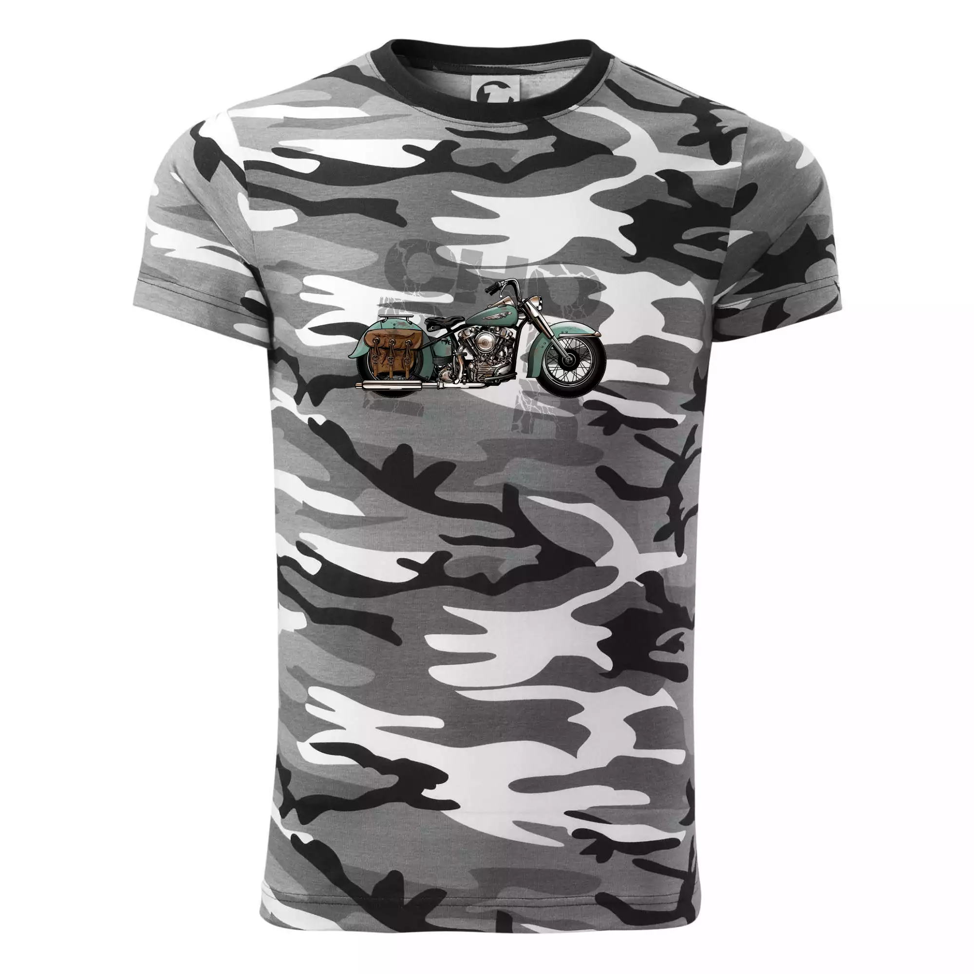 Tričko střední gramáže v barvách camouflage. Střih s bočními švy. Lem průkrčníku ze žebrového úpletu s přídavkem 5 % elastanu. Vnitřní část zadního průkrčníku začištěna páskou v barvě camouflage.