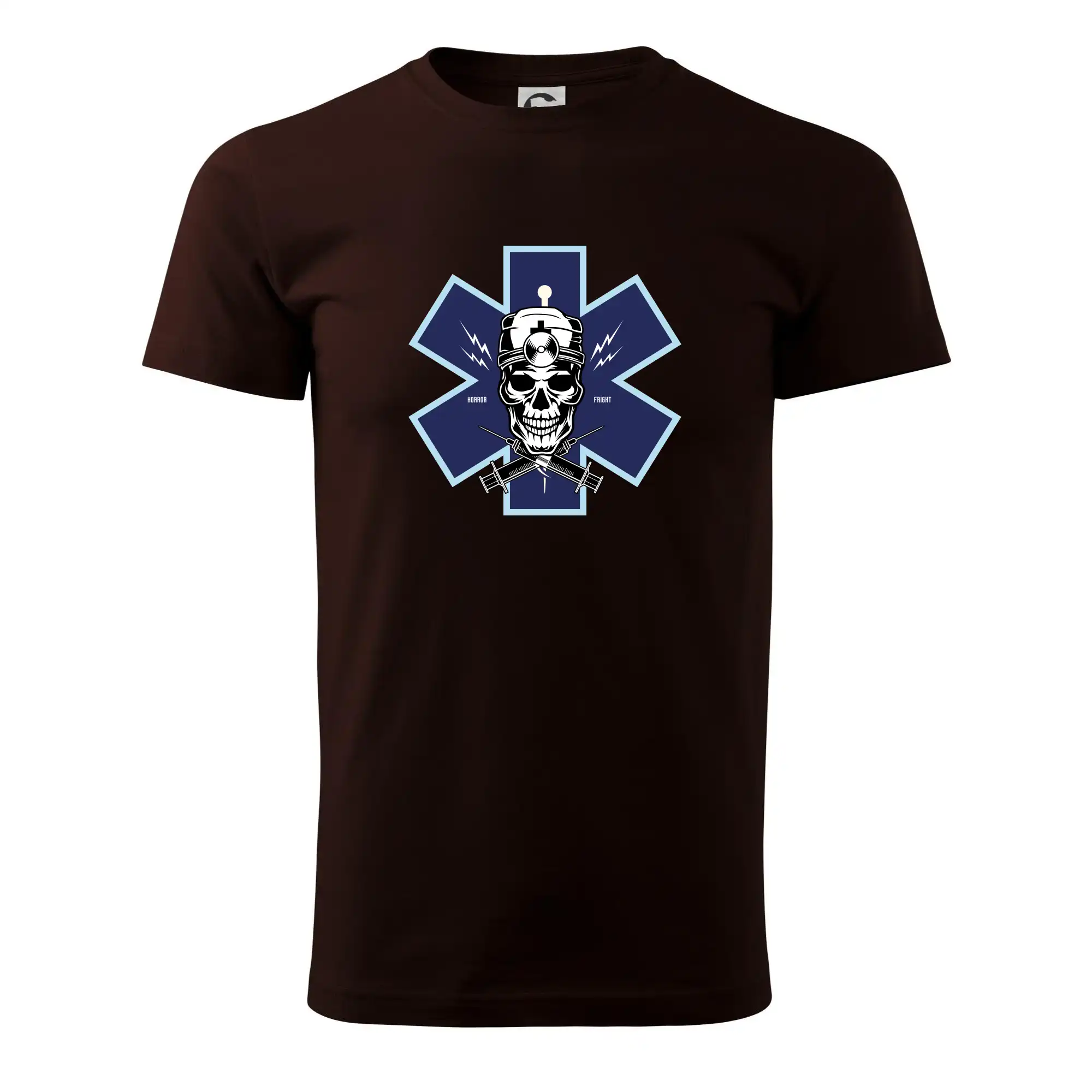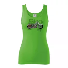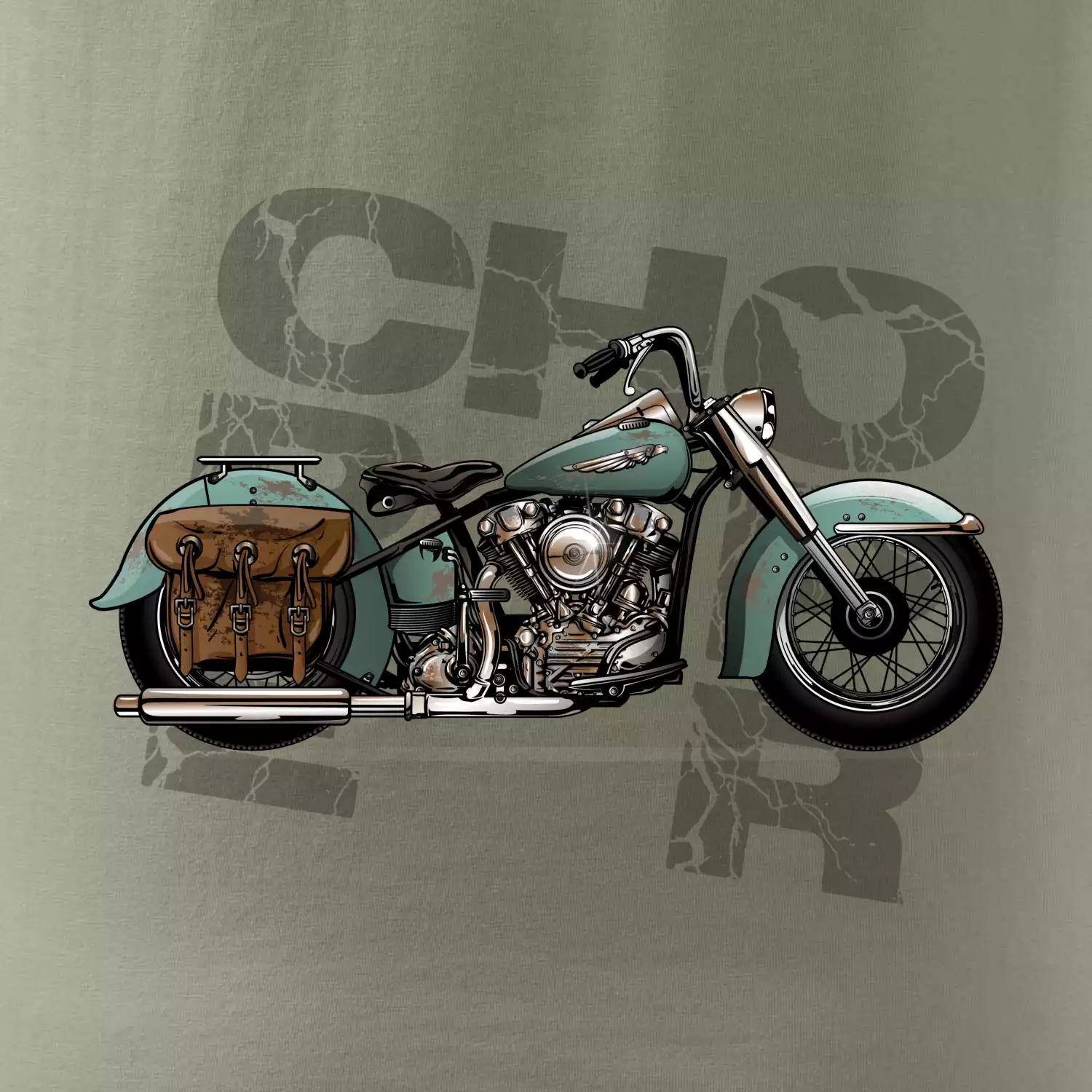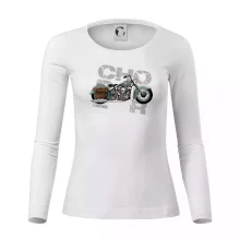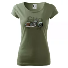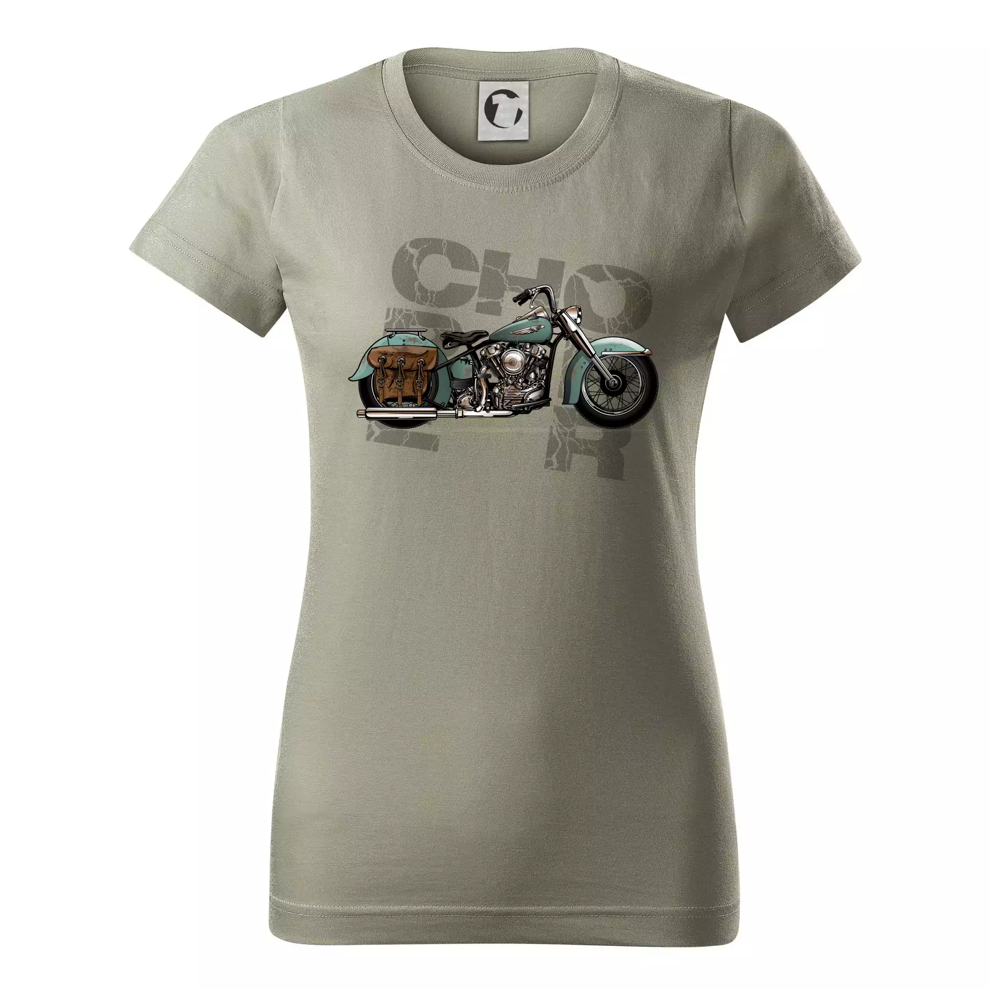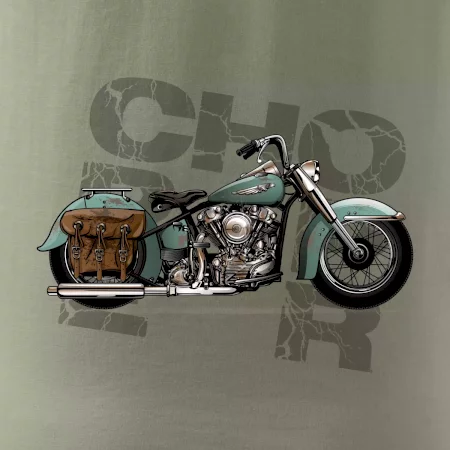 Triko pro motorkáře, na kterém je modrá motorka chopper s brašnou. Motocykl by měl mít na triku každý správný motorkář. Moto triko s motorkou je vhodný dárek pro motorkáře.