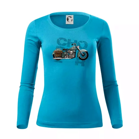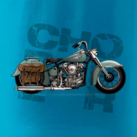 Triko pro motorkáře, na kterém je modrá motorka chopper s brašnou. Motocykl by měl mít na triku každý správný motorkář. Moto triko s motorkou je vhodný dárek pro motorkáře.