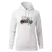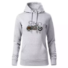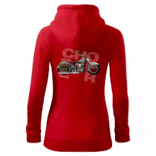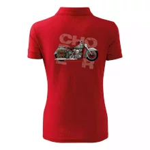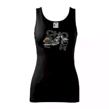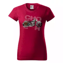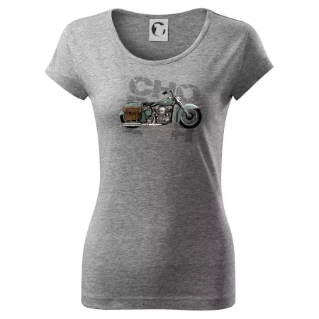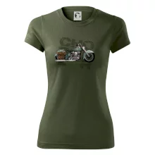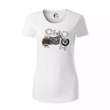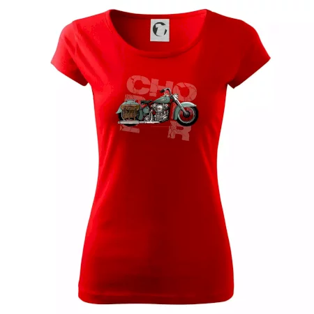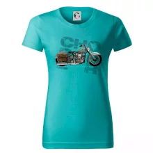 Triko pro motorkáře, na kterém je modrá motorka chopper s brašnou. Motocykl by měl mít na triku každý správný motorkář. Moto triko s motorkou je vhodný dárek pro motorkáře.