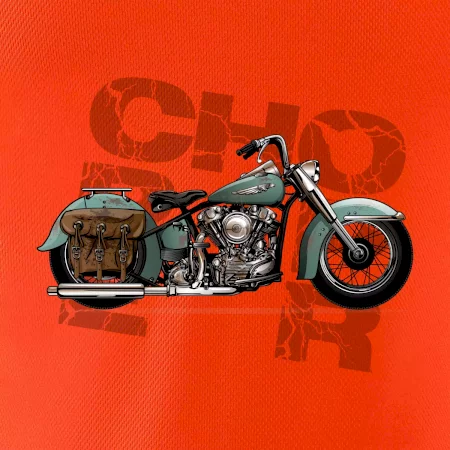 Triko pro motorkáře, na kterém je modrá motorka chopper s brašnou. Motocykl by měl mít na triku každý správný motorkář. Moto triko s motorkou je vhodný dárek pro motorkáře.