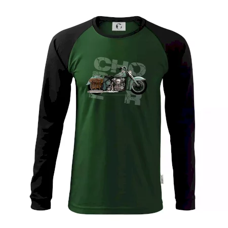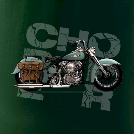 Triko pro motorkáře, na kterém je modrá motorka chopper s brašnou. Motocykl by měl mít na triku každý správný motorkář. Moto triko s motorkou je vhodný dárek pro motorkáře.