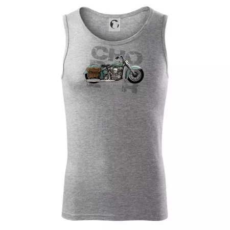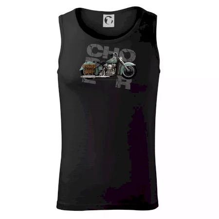 Triko pro motorkáře, na kterém je modrá motorka chopper s brašnou. Motocykl by měl mít na triku každý správný motorkář. Moto triko s motorkou je vhodný dárek pro motorkáře.