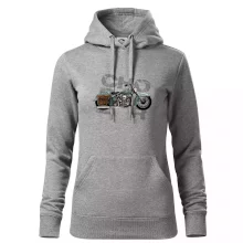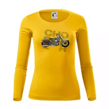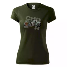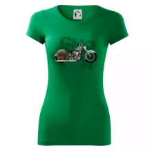 Triko pro motorkáře, na kterém je modrá motorka chopper s brašnou. Motocykl by měl mít na triku každý správný motorkář. Moto triko s motorkou je vhodný dárek pro motorkáře.