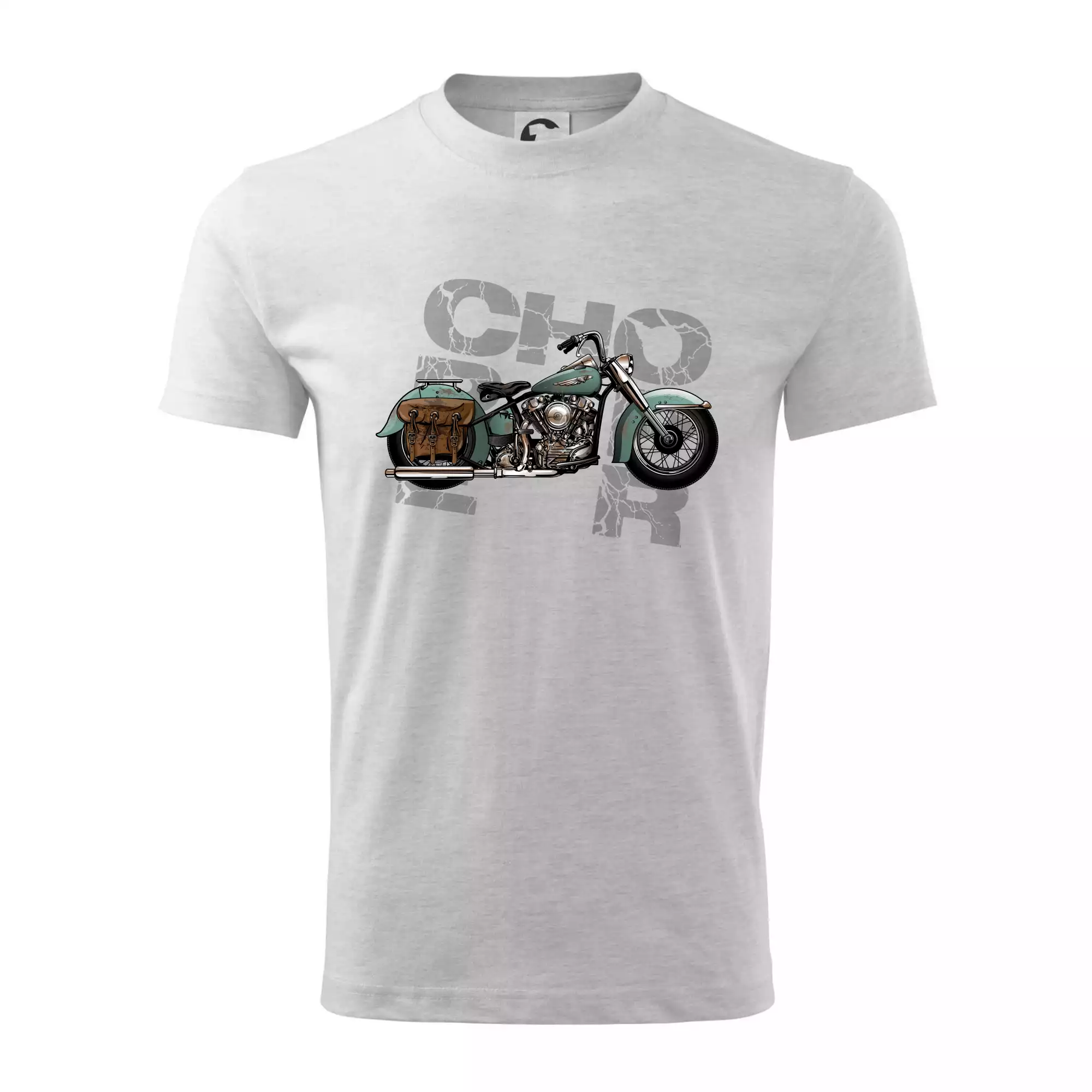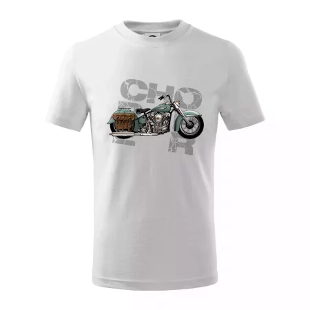 Triko pro motorkáře, na kterém je modrá motorka chopper s brašnou. Motocykl by měl mít na triku každý správný motorkář. Moto triko s motorkou je vhodný dárek pro motorkáře.