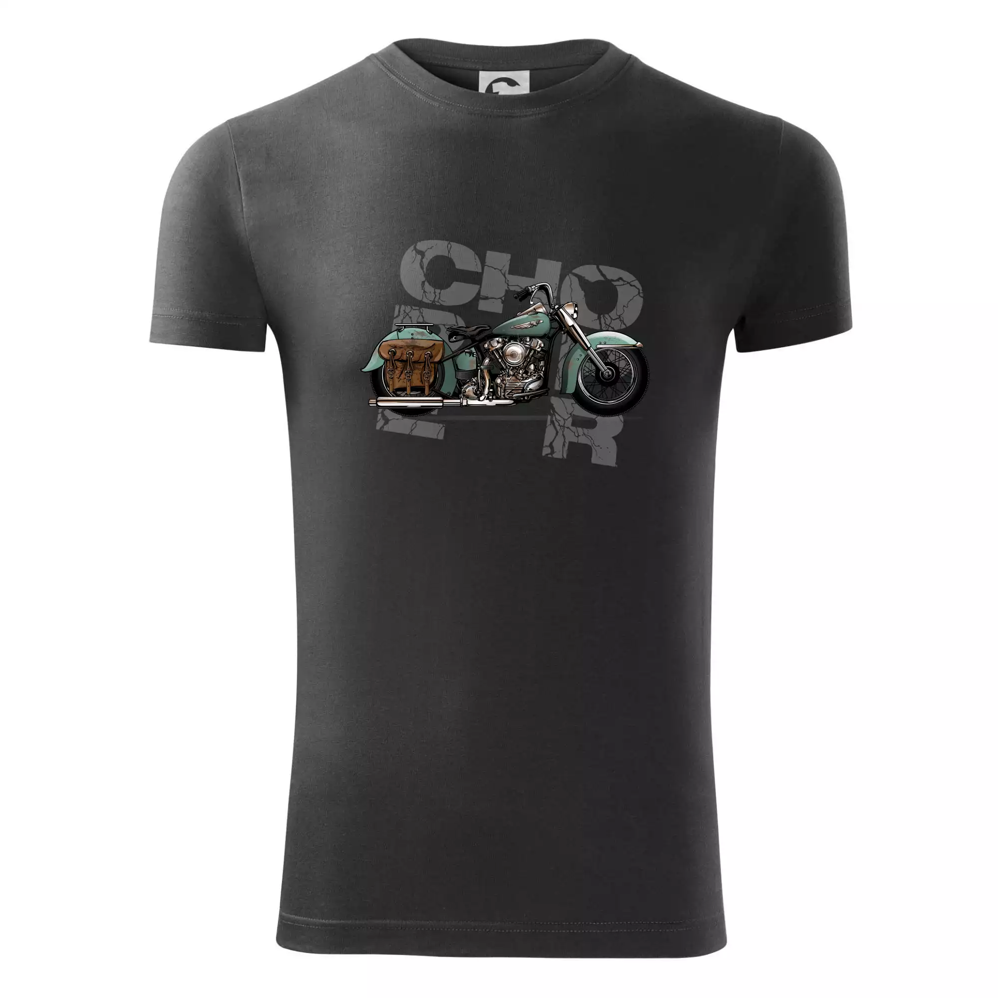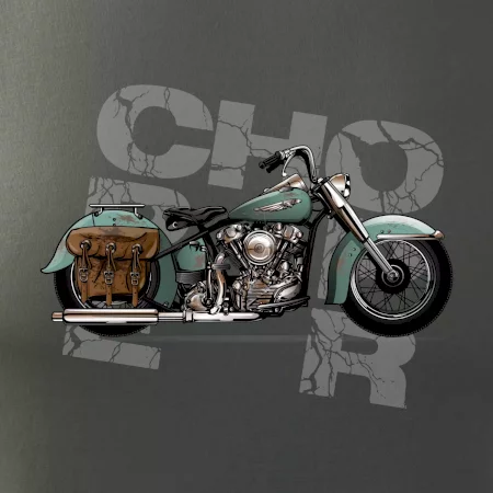 Triko pro motorkáře, na kterém je modrá motorka chopper s brašnou. Motocykl by měl mít na triku každý správný motorkář. Moto triko s motorkou je vhodný dárek pro motorkáře.