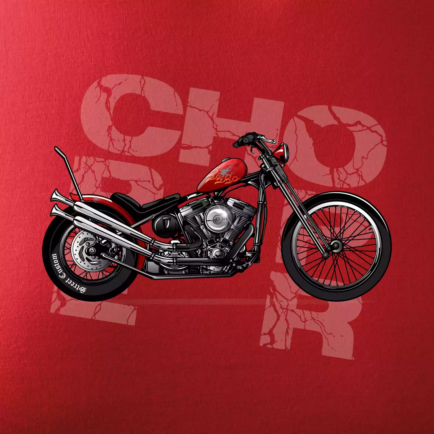 Triko pro motorkáře, na kterém je červená motorka chopper. Motocykl by měl mít na triku každý správný motorkář. Moto triko s motorkou je vhodný dárek pro motorkáře.