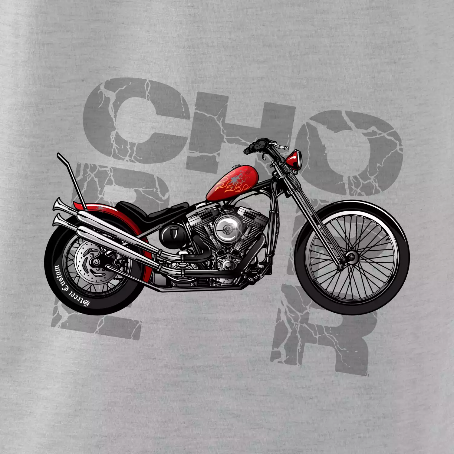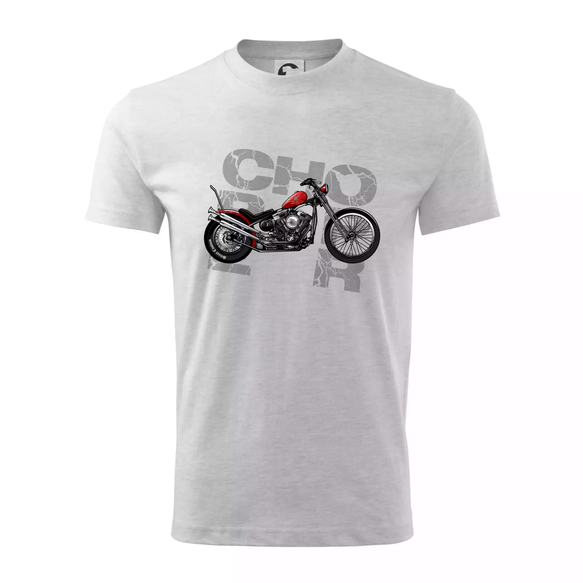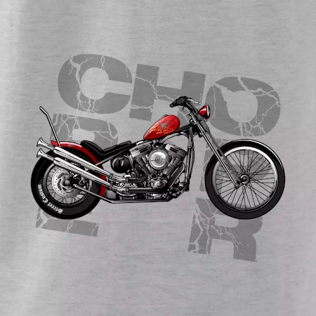 Triko pro motorkáře, na kterém je červená motorka chopper. Motocykl by měl mít na triku každý správný motorkář. Moto triko s motorkou je vhodný dárek pro motorkáře.