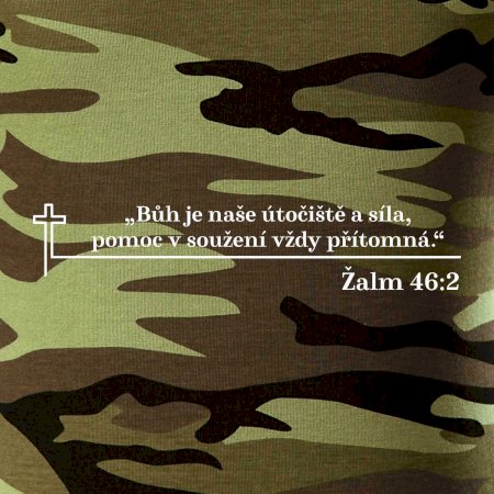 Tričko střední gramáže v barvách camouflage. Střih s bočními švy. Lem průkrčníku ze žebrového úpletu s přídavkem 5 % elastanu. Vnitřní část zadního průkrčníku začištěna páskou v barvě camouflage.