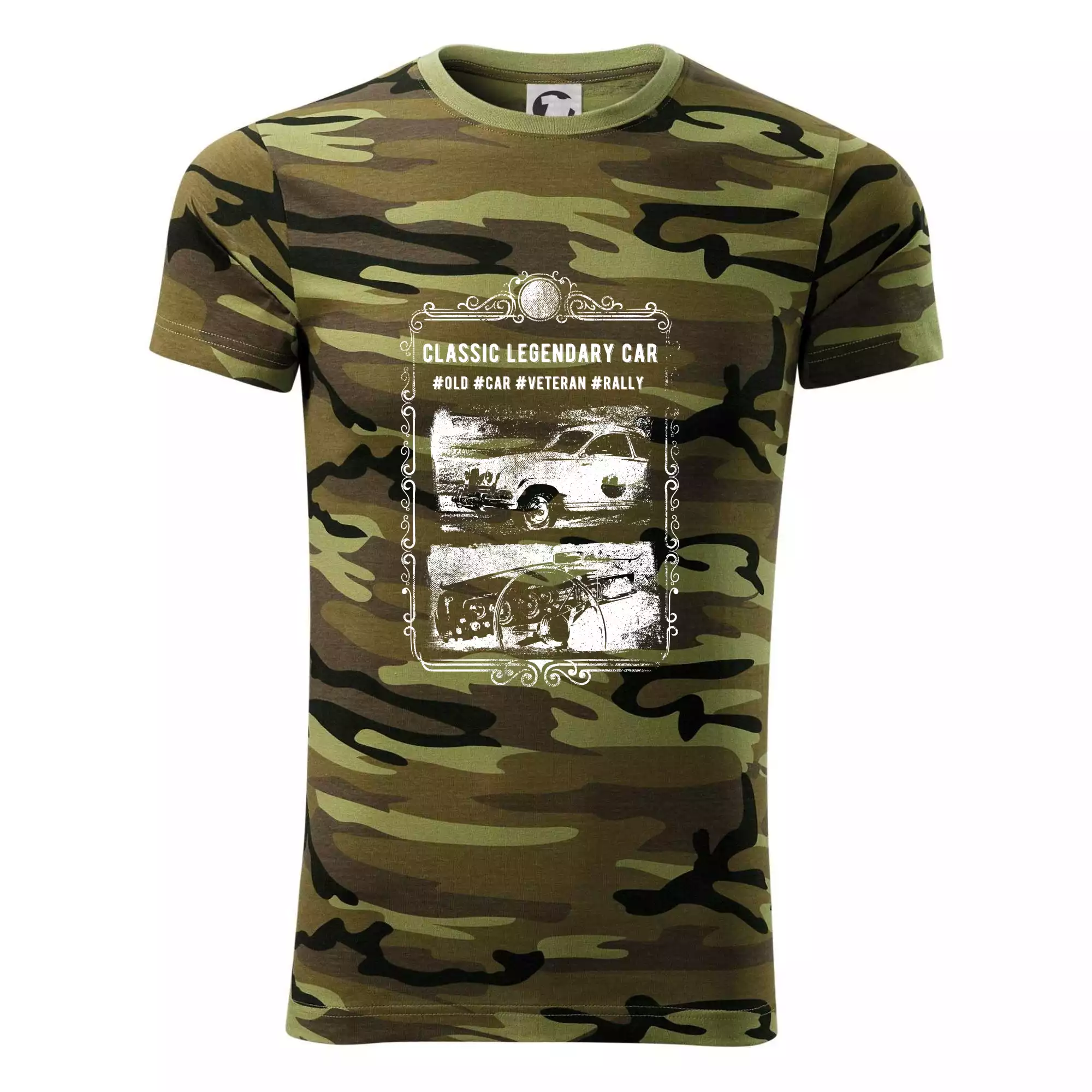 Tričko střední gramáže v barvách camouflage. Střih s bočními švy. Lem průkrčníku ze žebrového úpletu s přídavkem 5 % elastanu. Vnitřní část zadního průkrčníku začištěna páskou v barvě camouflage.