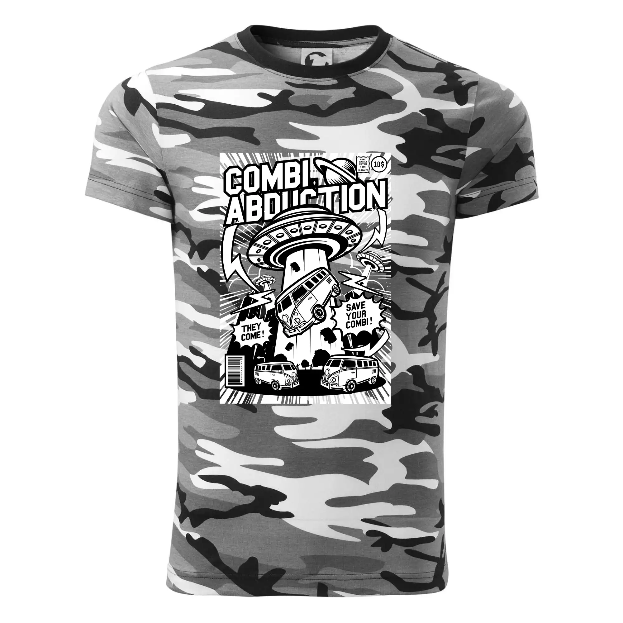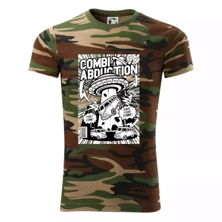 Tričko střední gramáže v barvách camouflage. Střih s bočními švy. Lem průkrčníku ze žebrového úpletu s přídavkem 5 % elastanu. Vnitřní část zadního průkrčníku začištěna páskou v barvě camouflage.