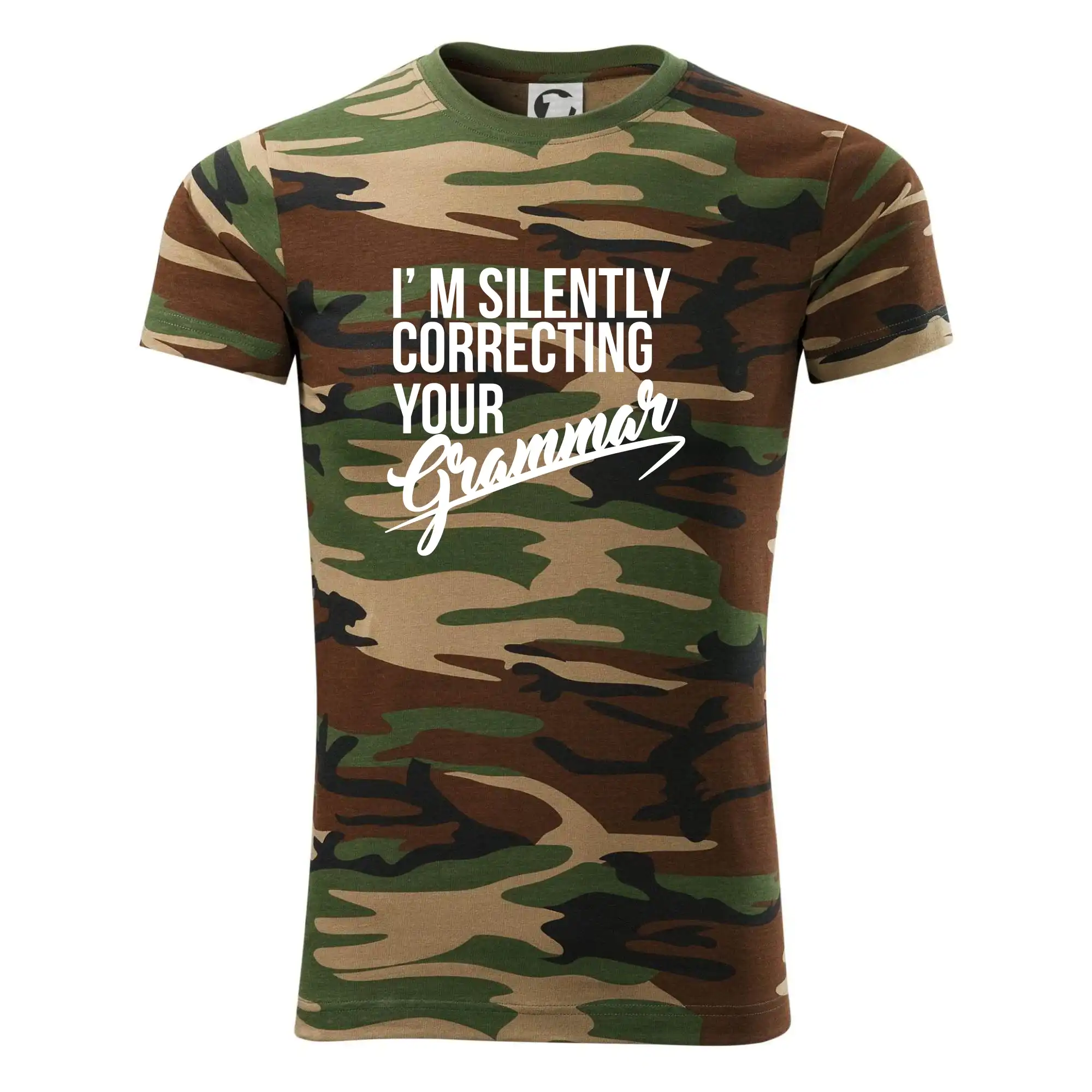 Tričko střední gramáže v barvách camouflage. Střih s bočními švy. Lem průkrčníku ze žebrového úpletu s přídavkem 5 % elastanu. Vnitřní část zadního průkrčníku začištěna páskou v barvě camouflage.