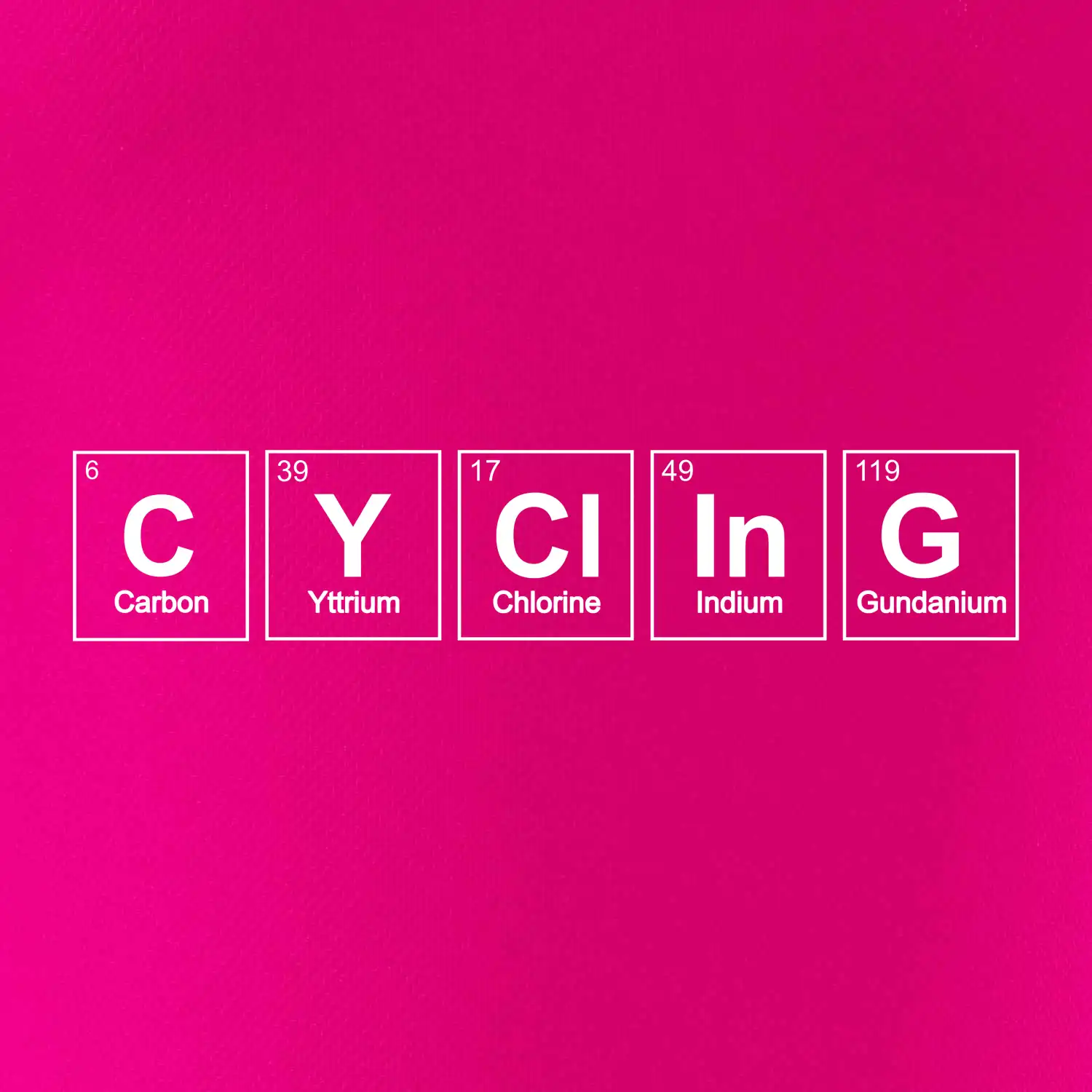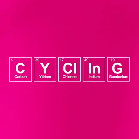 Cyklistické triko pro někoho, kdo má rád jízdu na kole. Z prvků periodické tabulky lze poskládat mnoho. Proč si tedy nevybrat ten správný prvek a na triko si nenatisknout třeba nápis CYClInG. Ukážeš tak, že cyklistika je tvůj koníček. Vtipné trička a mikiny s tématikou cyklistiky a periodických tabulek. Triko pro cyklistu. Trička a mikiny pro milovníky chemie a cyklistiky! Periodické tabulky frčí!