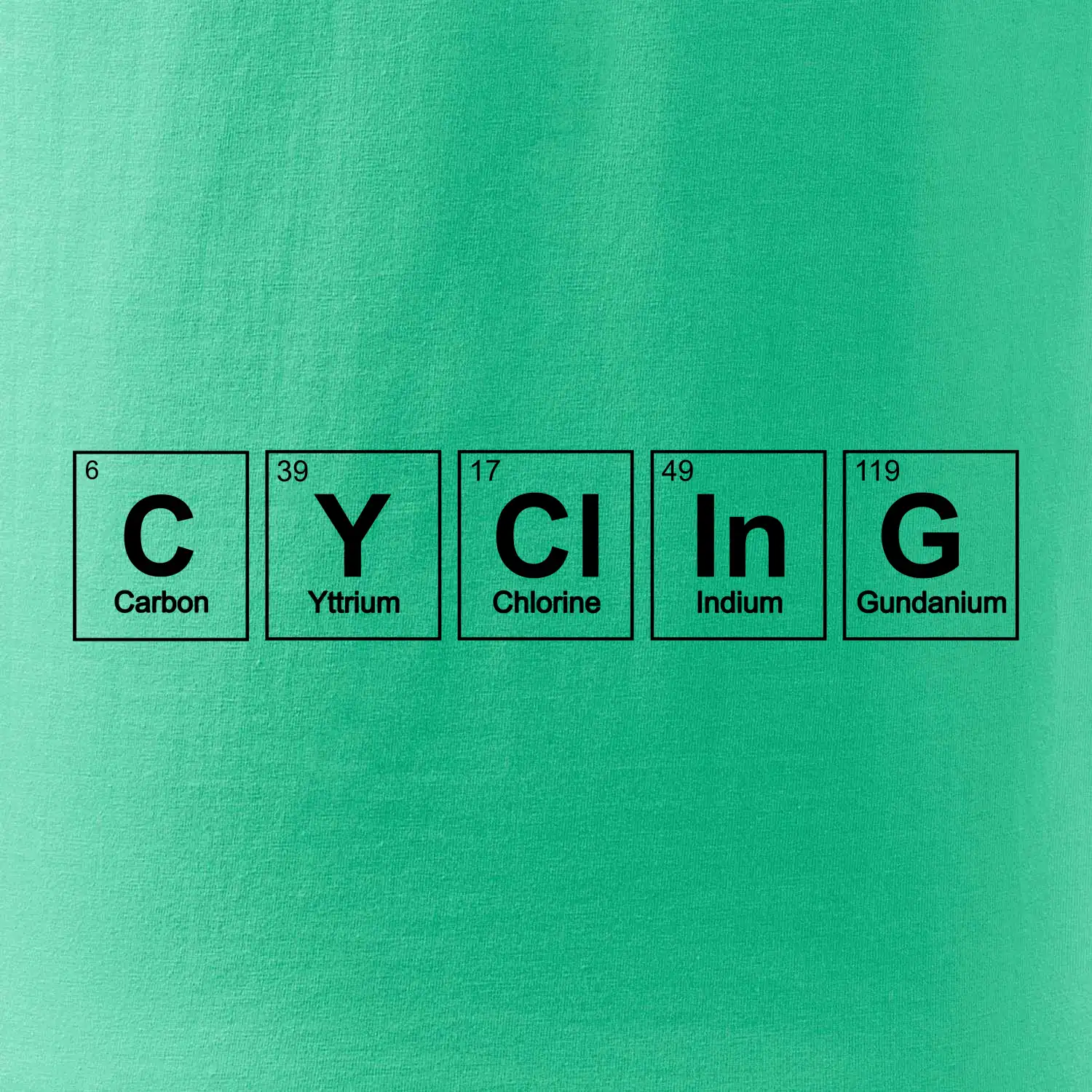 Cyklistické triko pro někoho, kdo má rád jízdu na kole. Z prvků periodické tabulky lze poskládat mnoho. Proč si tedy nevybrat ten správný prvek a na triko si nenatisknout třeba nápis CYClInG. Ukážeš tak, že cyklistika je tvůj koníček. Vtipné trička a mikiny s tématikou cyklistiky a periodických tabulek. Triko pro cyklistu. Trička a mikiny pro milovníky chemie a cyklistiky! Periodické tabulky frčí!