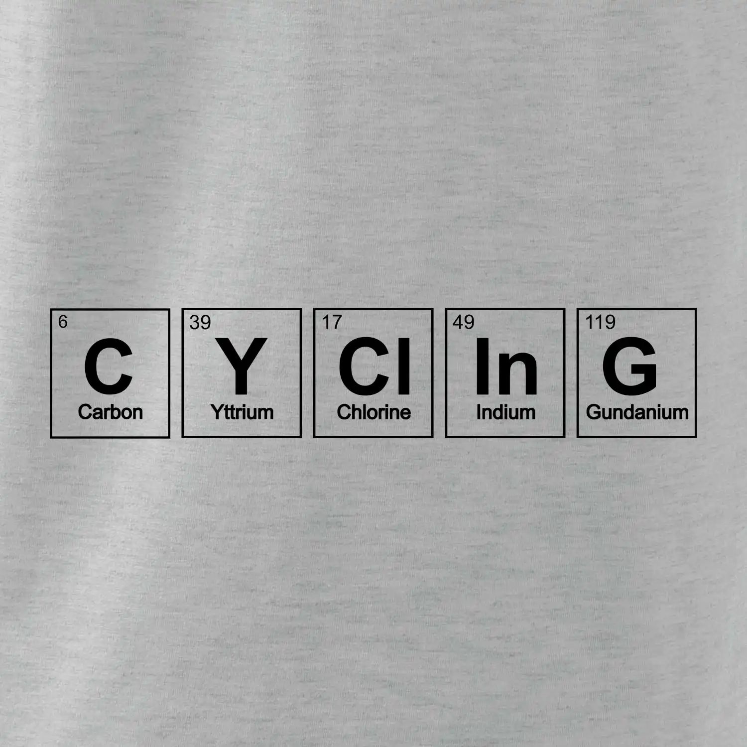 Cyklistické triko pro někoho, kdo má rád jízdu na kole. Z prvků periodické tabulky lze poskládat mnoho. Proč si tedy nevybrat ten správný prvek a na triko si nenatisknout třeba nápis CYClInG. Ukážeš tak, že cyklistika je tvůj koníček. Vtipné trička a mikiny s tématikou cyklistiky a periodických tabulek. Triko pro cyklistu. Trička a mikiny pro milovníky chemie a cyklistiky! Periodické tabulky frčí!