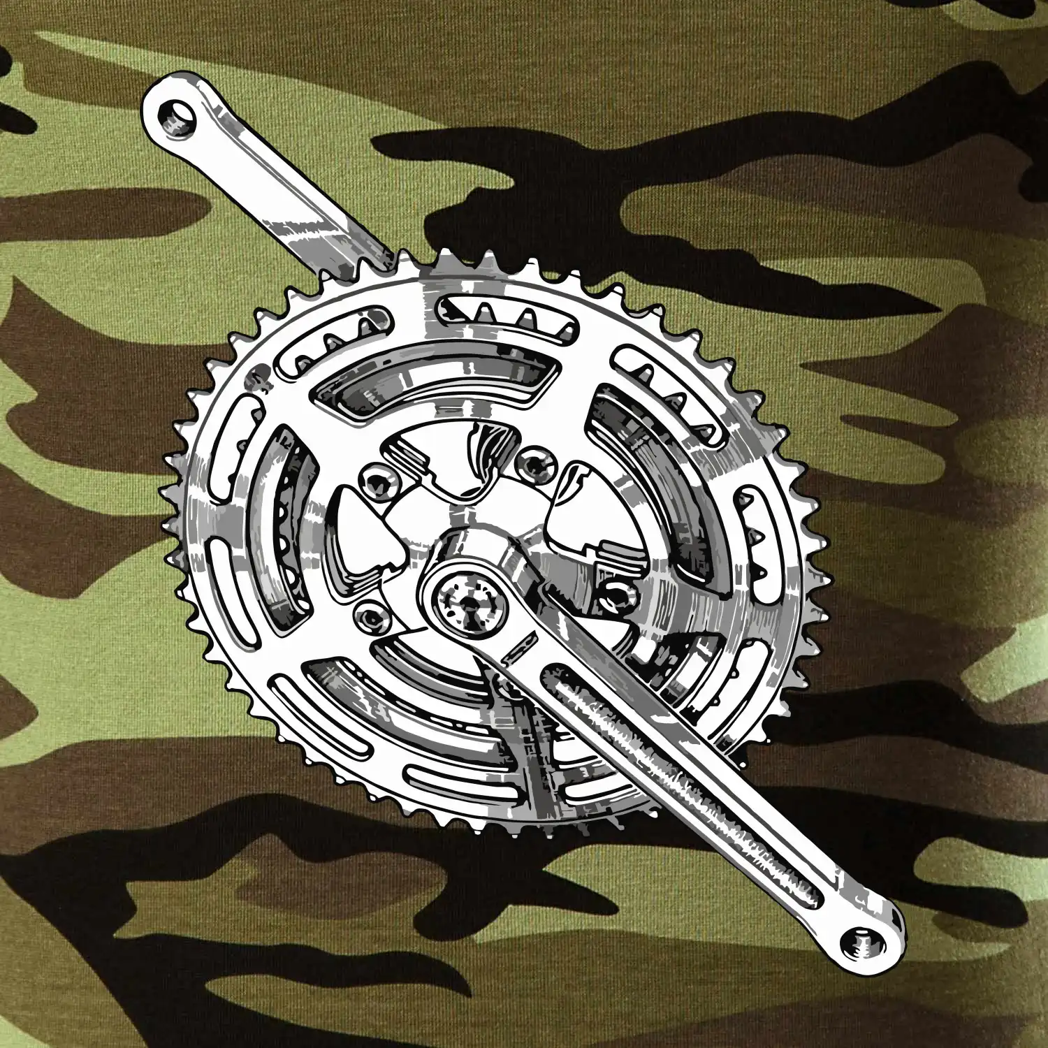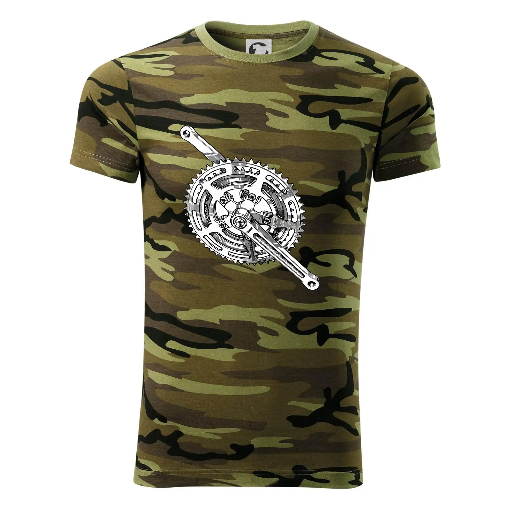 Tričko střední gramáže v barvách camouflage. Střih s bočními švy. Lem průkrčníku ze žebrového úpletu s přídavkem 5 % elastanu. Vnitřní část zadního průkrčníku začištěna páskou v barvě camouflage.