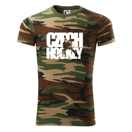 Tričko střední gramáže v barvách camouflage. Střih s bočními švy. Lem průkrčníku ze žebrového úpletu s přídavkem 5 % elastanu. Vnitřní část zadního průkrčníku začištěna páskou v barvě camouflage.