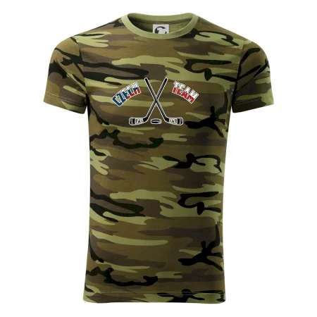 Tričko střední gramáže v barvách camouflage. Střih s bočními švy. Lem průkrčníku ze žebrového úpletu s přídavkem 5 % elastanu. Vnitřní část zadního průkrčníku začištěna páskou v barvě camouflage.