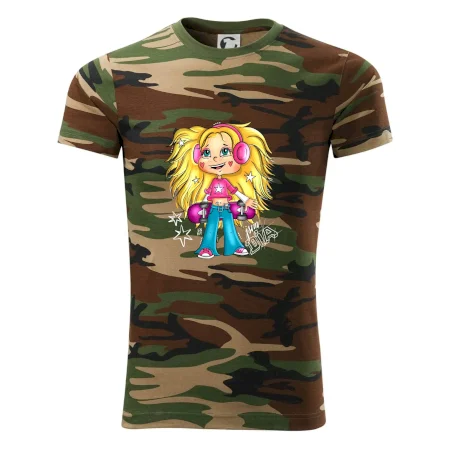 Tričko střední gramáže v barvách camouflage. Střih s bočními švy. Lem průkrčníku ze žebrového úpletu s přídavkem 5 % elastanu. Vnitřní část zadního průkrčníku začištěna páskou v barvě camouflage.