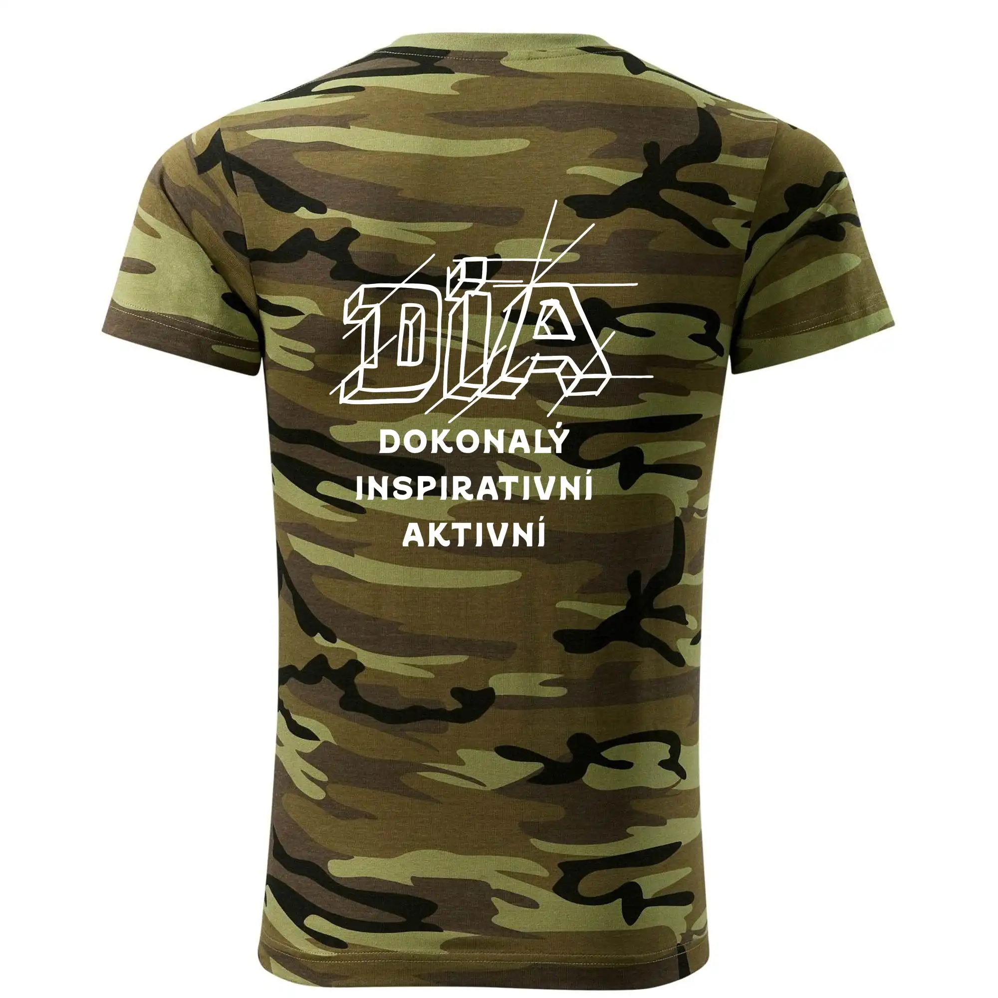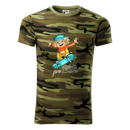 Tričko střední gramáže v barvách camouflage. Střih s bočními švy. Lem průkrčníku ze žebrového úpletu s přídavkem 5 % elastanu. Vnitřní část zadního průkrčníku začištěna páskou v barvě camouflage.