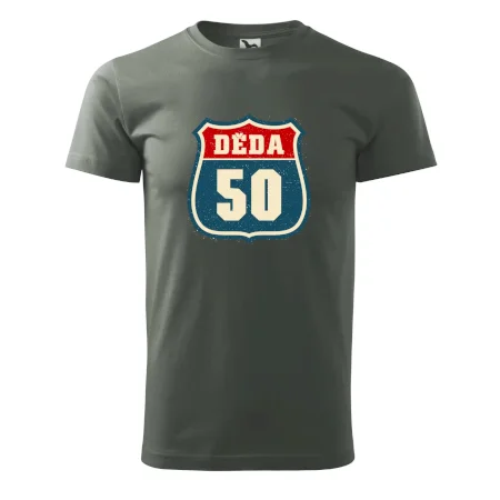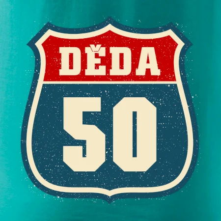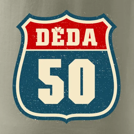 Motiv „Děda 50“ vypadá jako pravá americká silniční tabule – robustní rámeček, výrazné číslo jubilejních let a jednoduchý nápis „Děda“. Design připomíná slavné highway/route štíty z amerických dálnic, a dává všem kolem jasně najevo, že životní cesta vašeho dědy je nejen legendární, ale pořád v plné rychlosti!