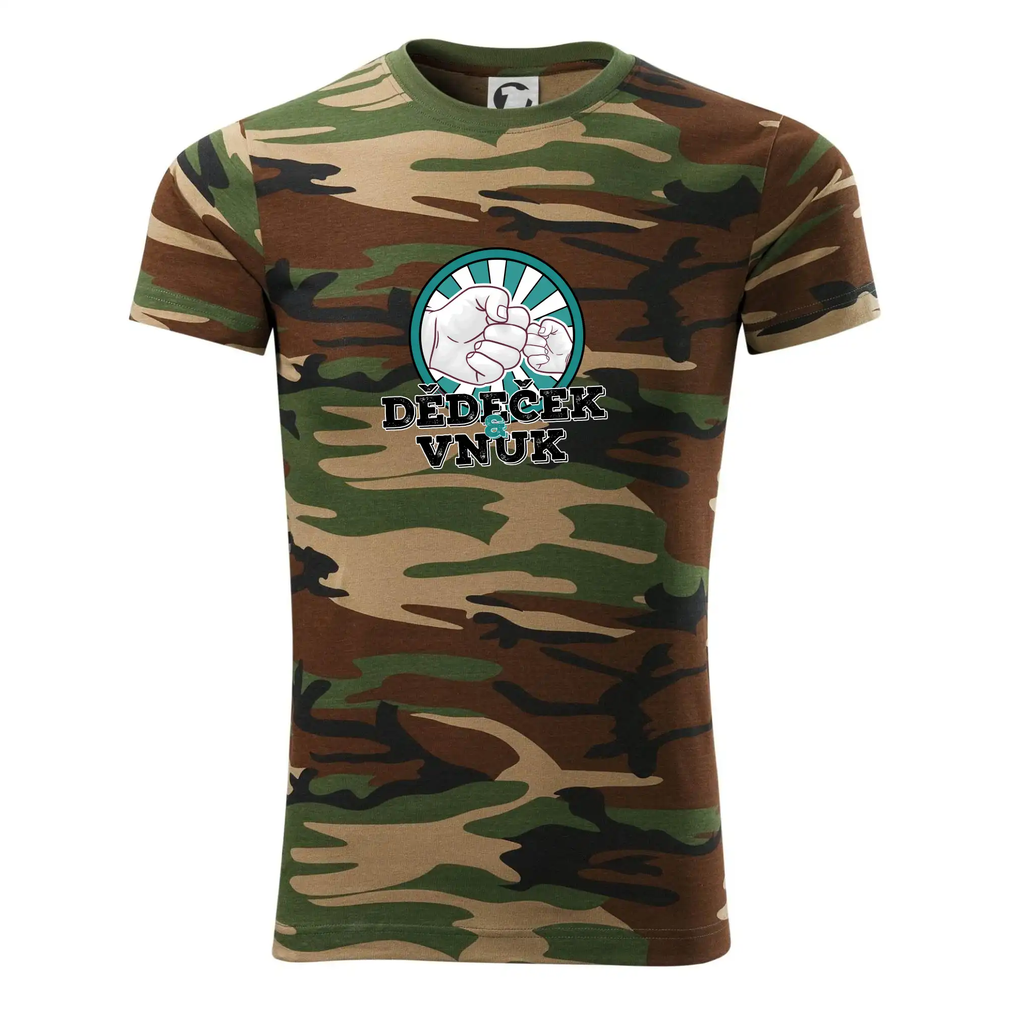 Tričko střední gramáže v barvách camouflage. Střih s bočními švy. Lem průkrčníku ze žebrového úpletu s přídavkem 5 % elastanu. Vnitřní část zadního průkrčníku začištěna páskou v barvě camouflage.