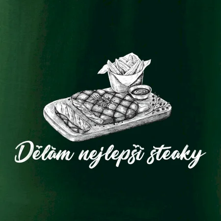 Triko pro kuchaře, na kterém je steak, hranolky a nápis "Dělám nejlepší steaky", by si měl pořídit každý kuchař, který má vaření opravdu rád. Triko pro kuchaře musí mít každý správný šéfkuchař i kuchtík, který má rád grilování. Vhodný dárek pro kuchaře, který má rád jídlo, hlavně maso.