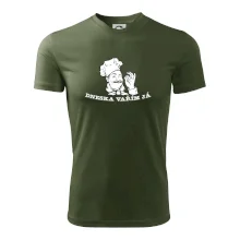 Triko pro kuchaře, na kterém je šéfkuchař s nápisem "Dneska vařím já", je vhodný dárek pro kuchaře. každý kuchař i kuchtík, který má rád vaření, by měl mít tohle triko doma.