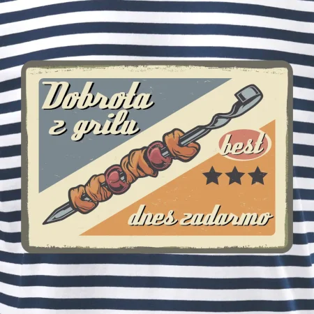 Triko pro gurmána, který má rád grilování, zdobí nápis "Dobrota z grilu, dnes zadarmo" a grilovaný masový špíz. Triko pro kuchaře by si měl pořídit každý, kdo je pravý pán grilu! Triko s grilem je vhodný dárek pro kuchaře na letní grilování na zahradě.
