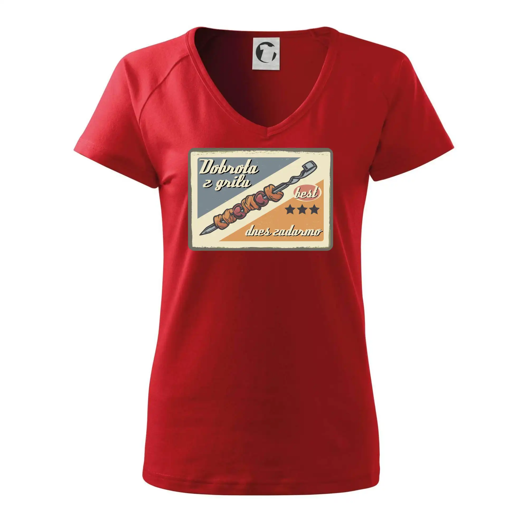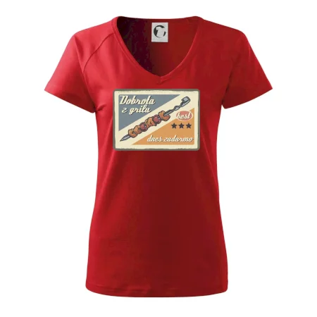 Triko pro gurmána, který má rád grilování, zdobí nápis "Dobrota z grilu, dnes zadarmo" a grilovaný masový špíz. Triko pro kuchaře by si měl pořídit každý, kdo je pravý pán grilu! Triko s grilem je vhodný dárek pro kuchaře na letní grilování na zahradě.