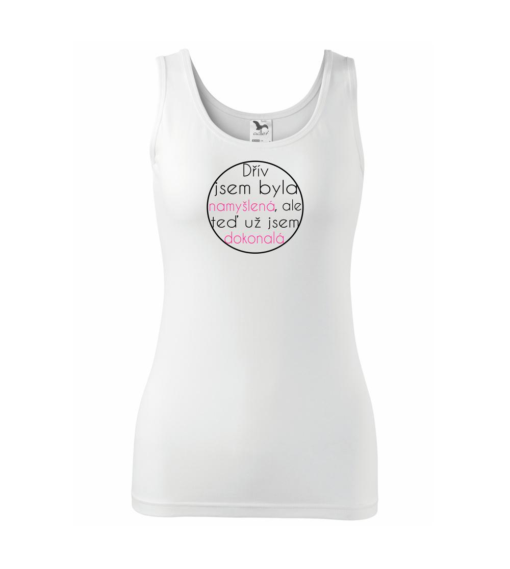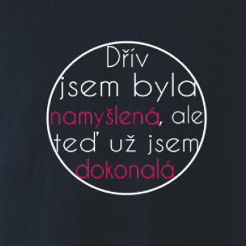 Vtipné tričko pro holku s nápisem "Dřív jsem byla namyšlená, ale teď už jsem dokonalá." Dárek pro vtipnou holku.