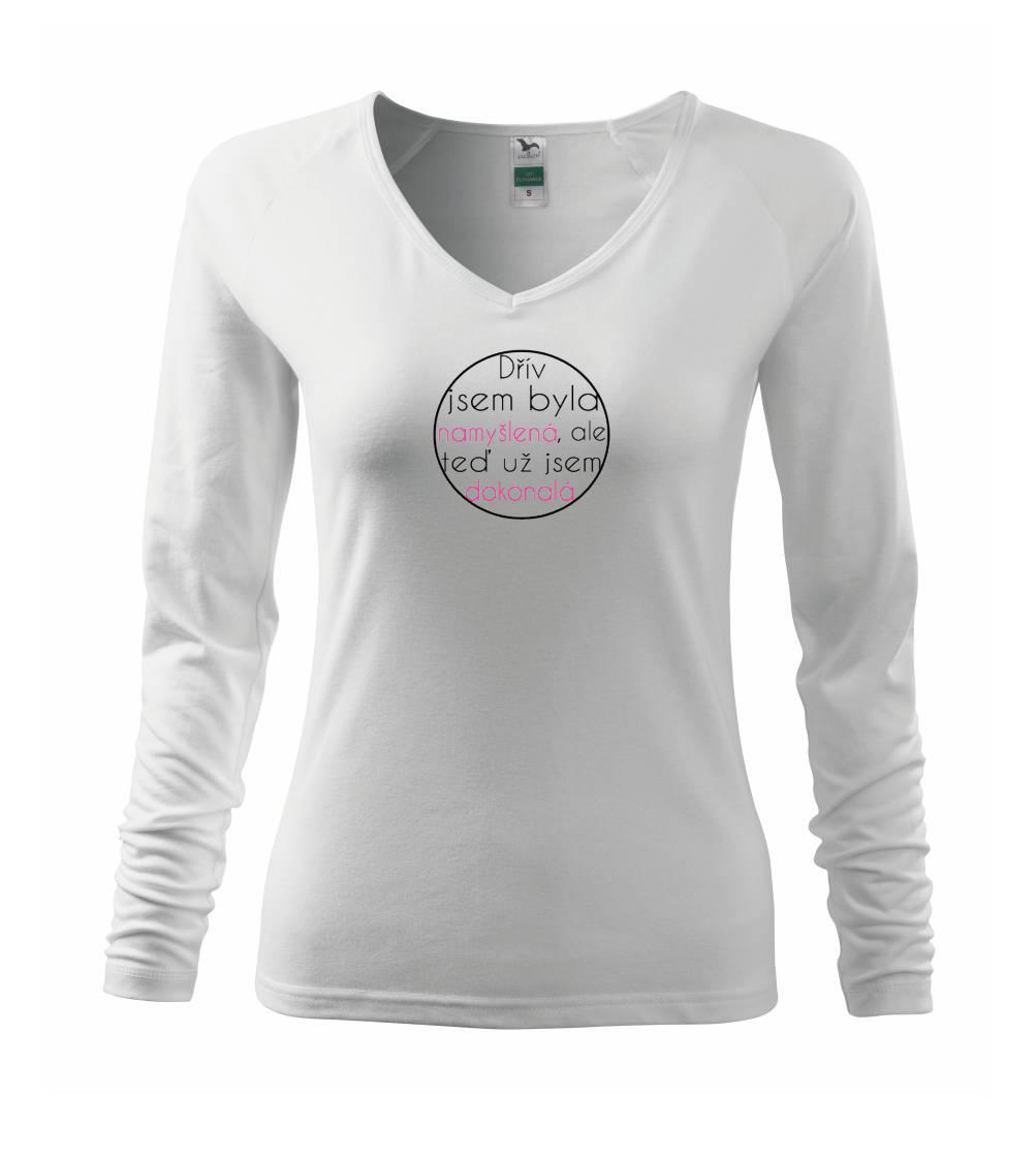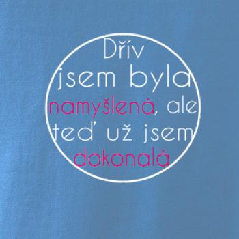 Vtipné tričko pro holku s nápisem "Dřív jsem byla namyšlená, ale teď už jsem dokonalá." Dárek pro vtipnou holku.