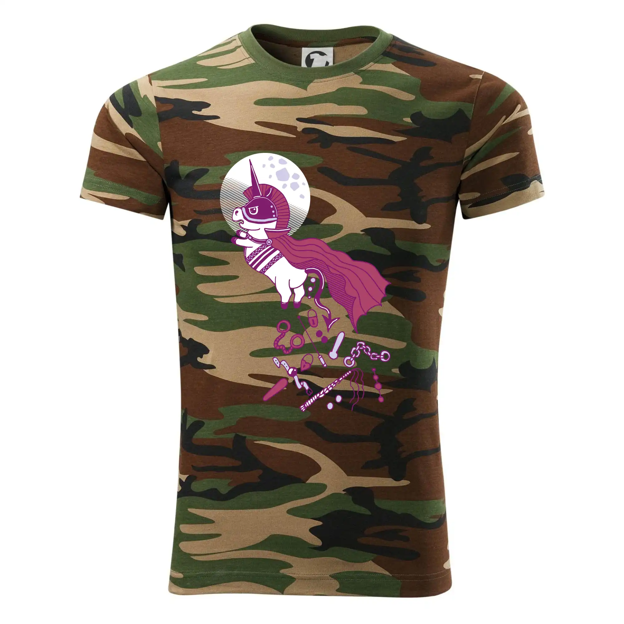 Tričko střední gramáže v barvách camouflage. Střih s bočními švy. Lem průkrčníku ze žebrového úpletu s přídavkem 5 % elastanu. Vnitřní část zadního průkrčníku začištěna páskou v barvě camouflage.